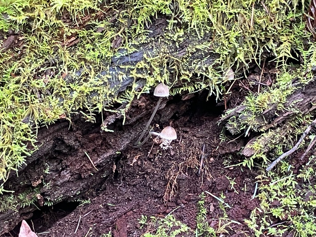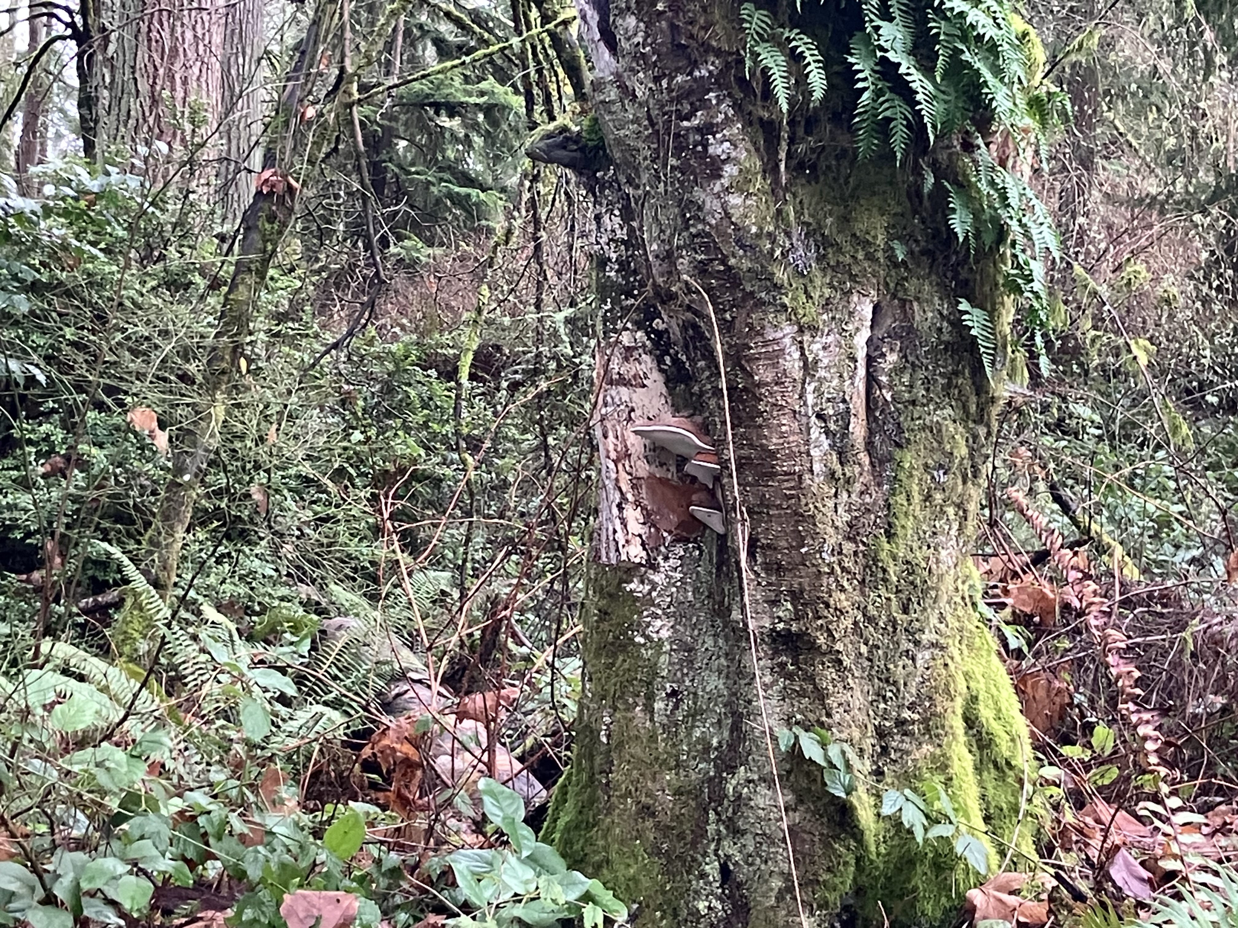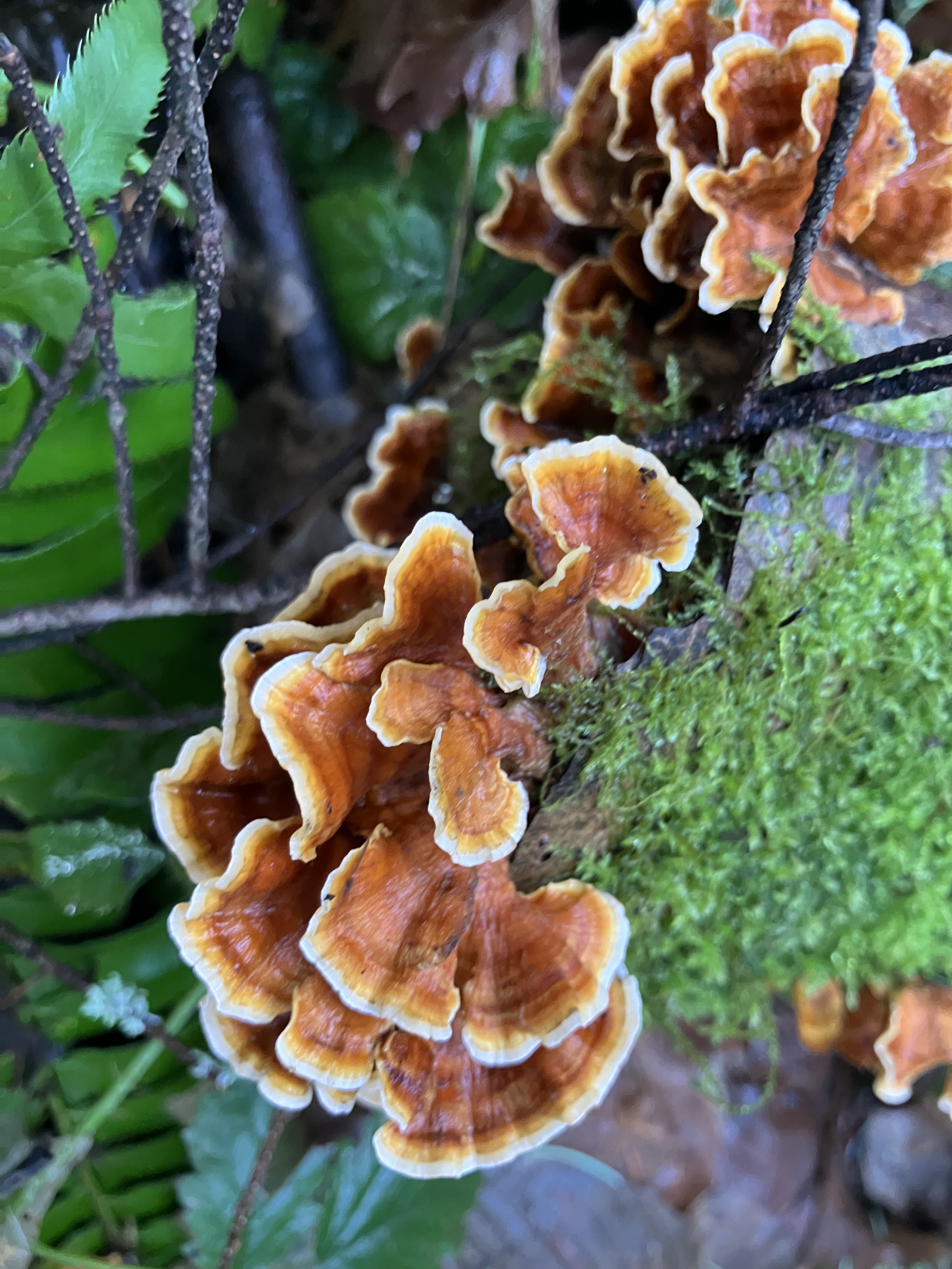 There are always mycological mysteries in the woods to look for here in The Pacific Northwest. These turkey tail variants were a bright spot in the leaf litter and fallen branches from recent wind storms in the fall of 2025. Now, the last day of January 2026 reveals more breakdown happening in these fungal forests. Debris is the key to a healthy temperate rainforest. Needles, leaves, logs, stumps, and twigs were once part of something living that banked nutrients and sun energy into living material, which in time, follows through its lifecycle and returns to dead matter on the ground from whence it came. Thus, the nutrients and sun energy is returned to the soil and redistributed back into the forest for current and future vegetative growth. That’s how massive forests continue to mature and survive. The mushrooms are playing two key roles in this cycle by breaking down the dead matter, and carrying it around through their mycelia, underground, to surrounding parts of the forest that need the nourishment.