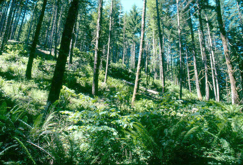 Commercial timber operations are mono-crops- with Douglas fir being the most profitable mass produced wood products. The green forest re-plantings are sterile environments, providing little habitat diversity for wildlife. Native plants diapear from the environment, and fern stands dominate what little under-story manages to take hold.