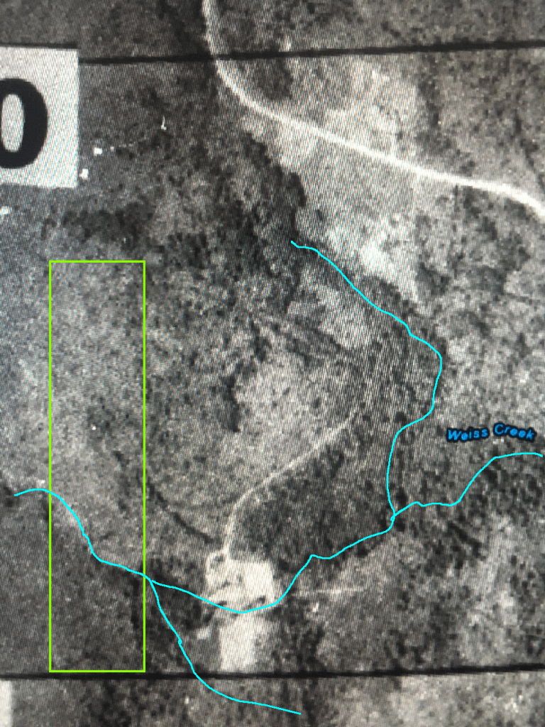 Above is the earliest photograph of EEC Forest Stewardship land (boxed in green). Here, by the 1930s, all the old growth had been cut, clearing the land for dairy farms, which quickly began developing throughout the Snoqualmie Valley. Many cuts were not replanted, and so, natural seeding began. This is evident on the northern part of EEC, above Weiss Creek, also drawn in and labeled. Just to the right of our Forest Stewardship property, there is a dark grove, left untouched. This grove is still untouched today, with a few second growth giants hiding within. To the right of the old grove, there is massive disturbance- right in the middle of the creek. I’m not sure what was going on, but all evidence of human activity is covered over in alder trees today.