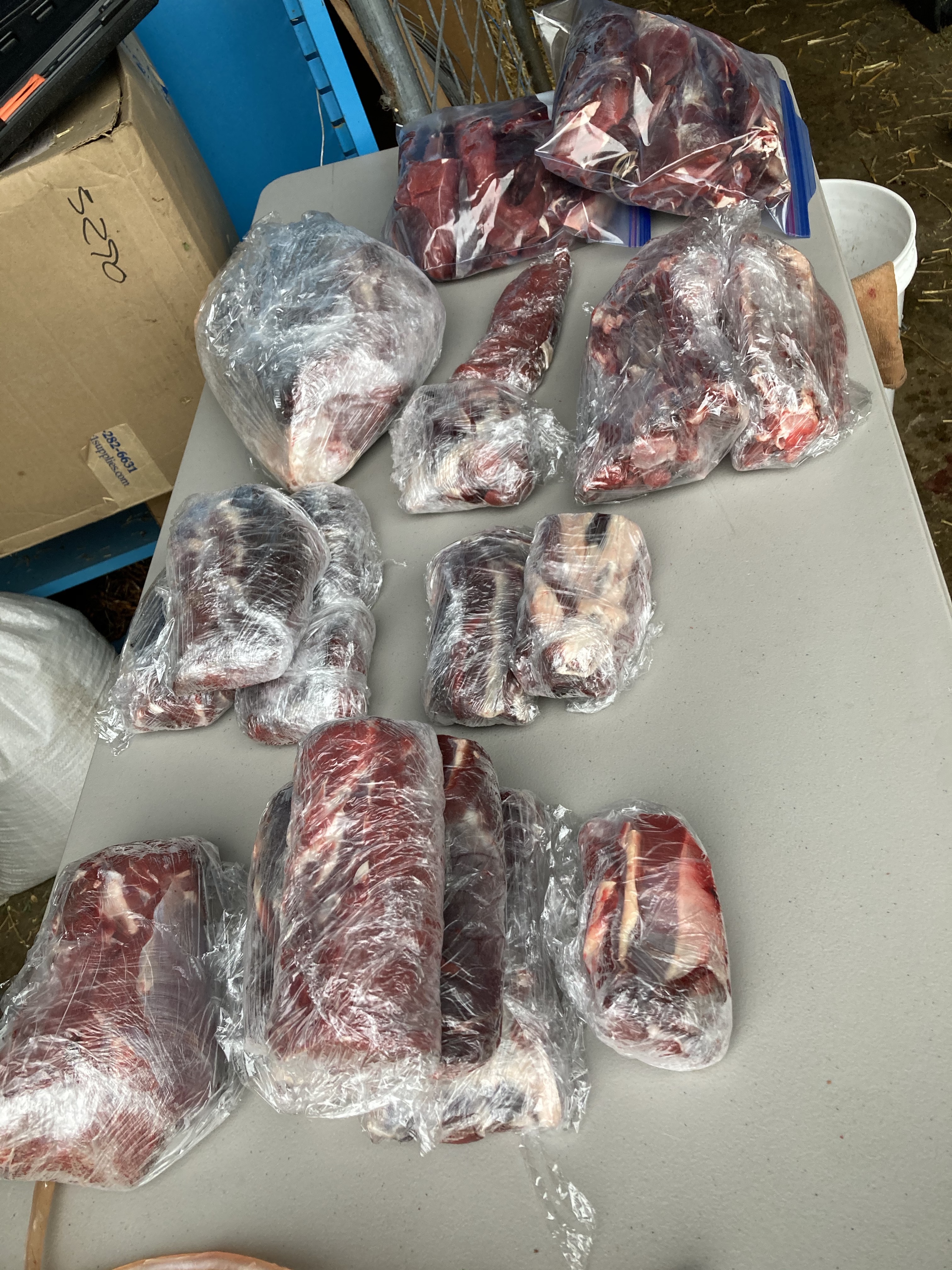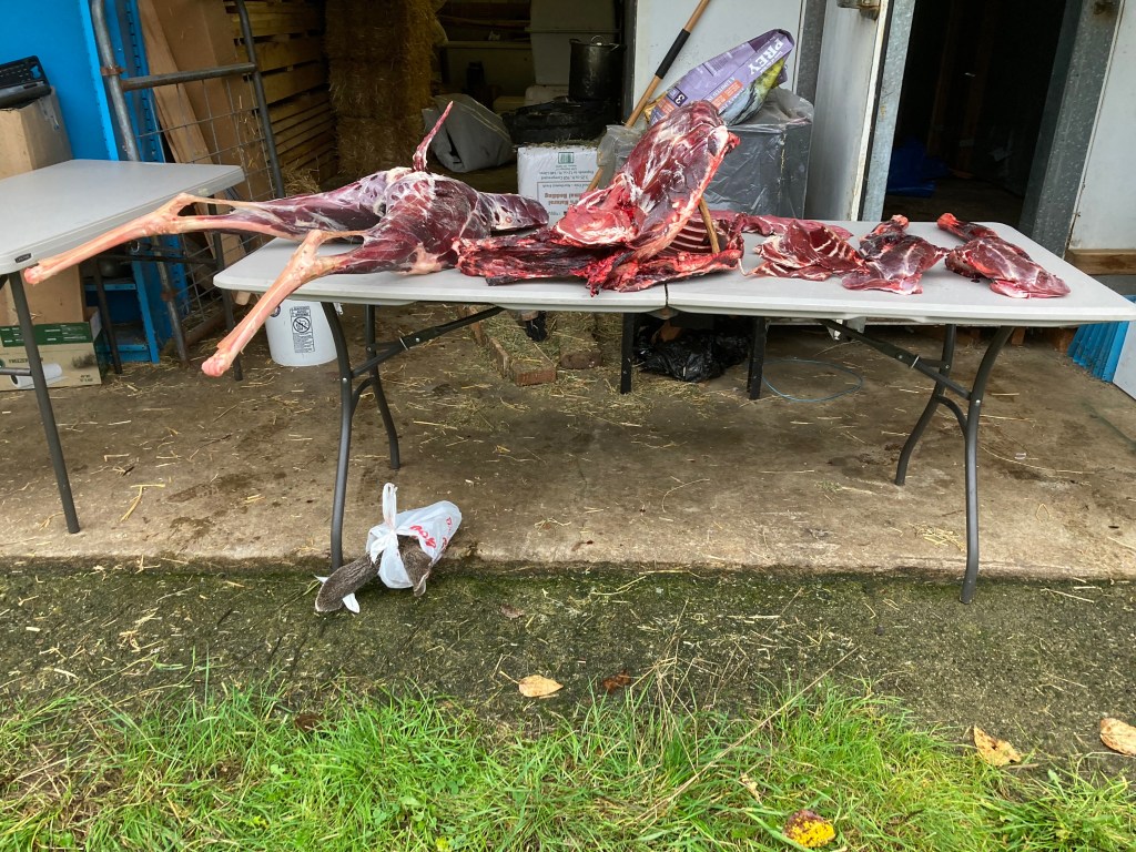 After harvesting the animal, I age the carcass in our walk in cooler for a few weeks before butchering. The amount of food from one animal is more than enough for me and my partner to share through the next year. Between that and our livestock, we don’t have to buy any commercial meat. That keeps our money out of industrial fast food feed lots. It also reinforces my direct connection to my food, from birth to death- even this deer was eating off the land which I tend, and enjoying all the rich biodiversity planted at EEC Forest Stewardship. In return, the deer feeds me, and I again plant more food and restore more habitat for the deer. It’s a restoration cycle which benefits all life.