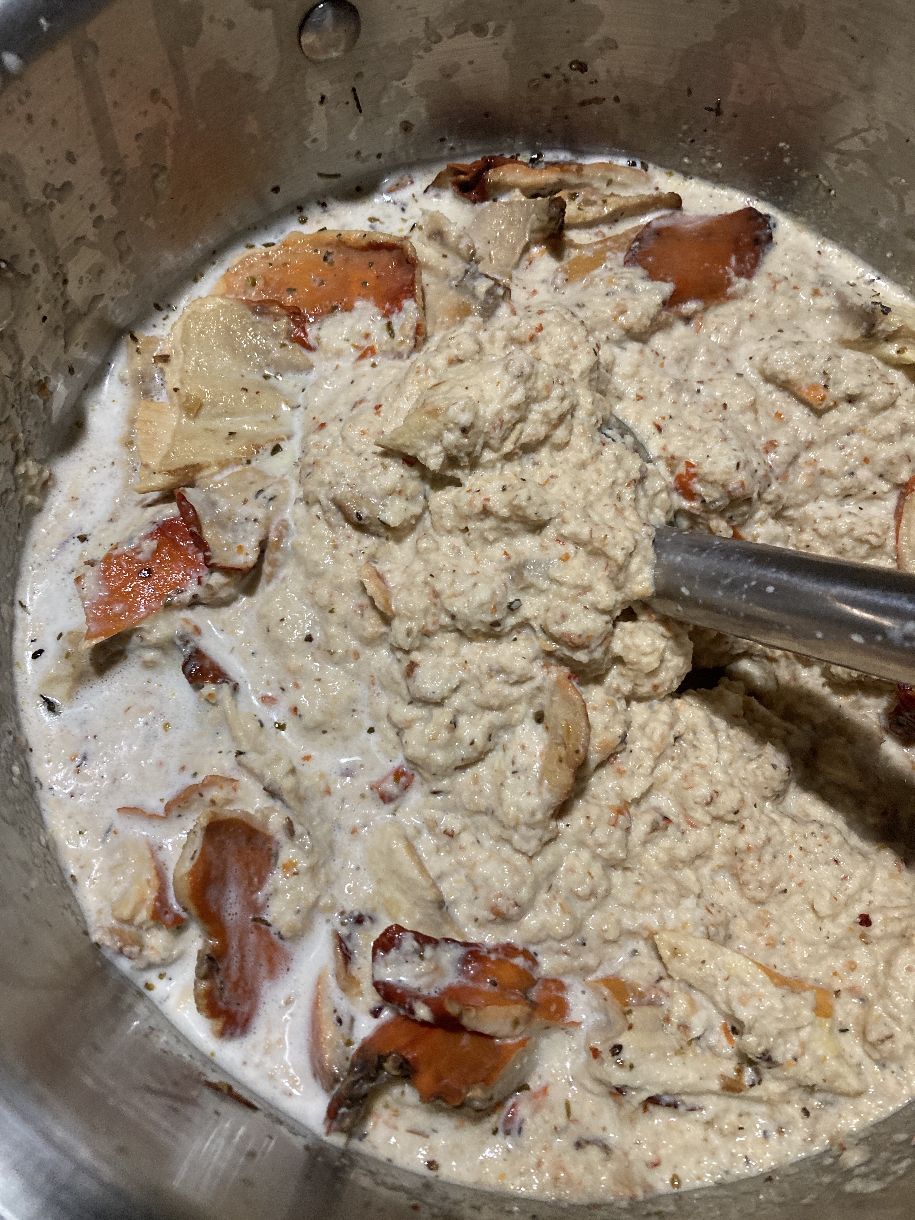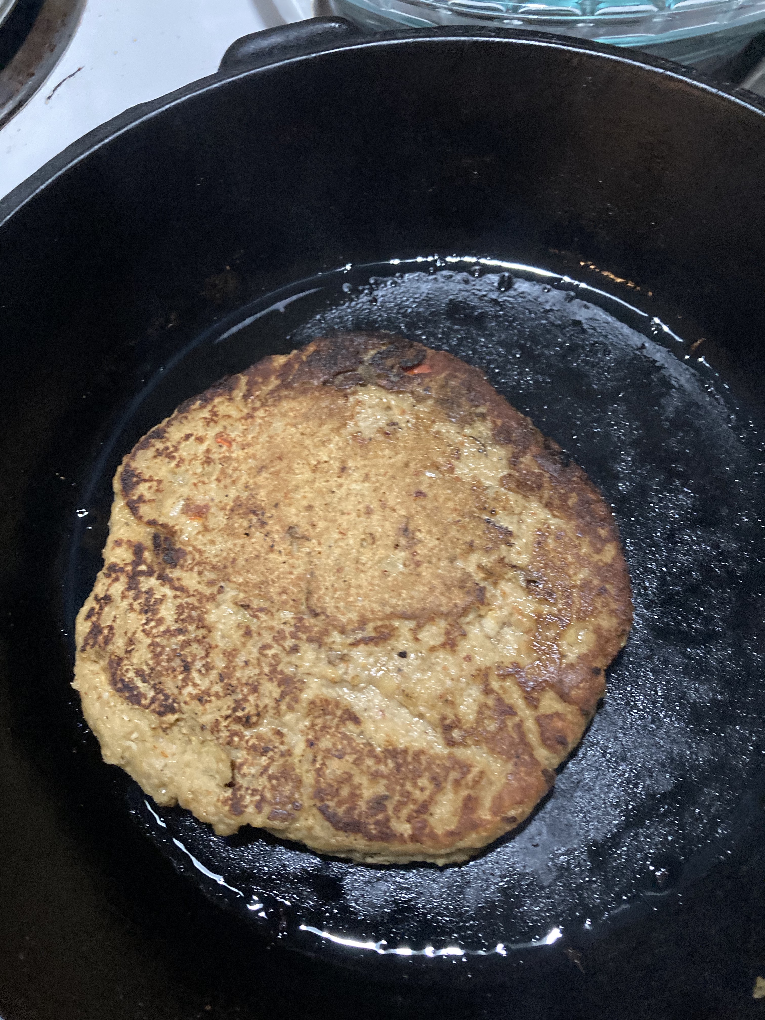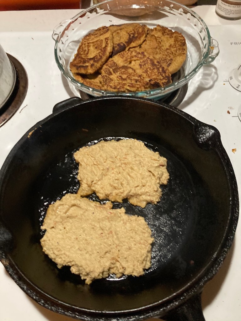 Reaching into the freezer, I pulled out a gallon bag of the sauteed CotW to thaw out for a tasty winter meal. I had planned to pulverize the mushroom into a soup, and began cooking the fungus down in a large pot. Then I took my hand mixer and began transforming the fruit into mush. The “meat” mashed right up, but rendered into a mousse like consistency. I added a bit of milk, hoping to “soup up” the sauce. Instead- I began to have the feeling I was stirring a batter. The pancake inspiration came, so I added a few eggs. The seasoning already on the mushrooms was garlic and herb, so I pictured savory latkes. Because these fungal fruits had fed off an evergreen log, they had that slightly bitter taste of pine tree, so I knew I had to put a little more salt and oil in to cut that taste. Onion was also a great addition, though I used flakes to save time. I will caramelize some first before adding next time.