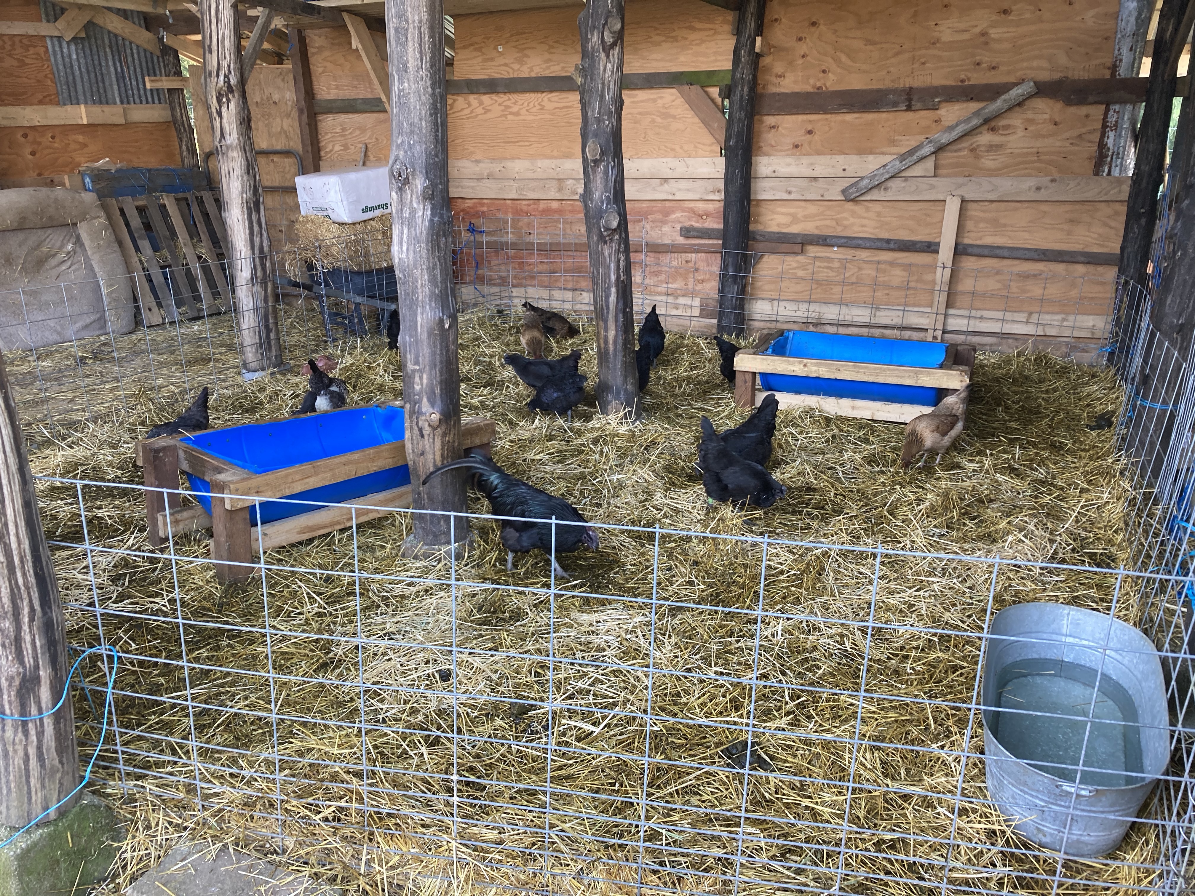 The sheep get to enjoy straw as bedding, where it mixes passively with sheep poop and pee, creating a rich mesh of compost to be turned into healthy topsoil for native replanting. But when I started putting the straw into the barn stall for the sheep, they went to eating it, rather than sleeping on it, and this was distressing because then they were laying in their muck. I tried putting the straw down while they were enjoying their alfalfa, but they’d still take to it when done with the prime feed, reducing the bedding to less than adequate cover- especially in a deep litter system. I was at a loss, and tried many solutions from stomping all over the fresh straw to moving the girls in circles around the pen until they had stomped all over the straw with mucky feet- and they still nibbled here and there. Then one day, I had put the sheep out and spread the straw in the empty barn. When I brought the sheep in at the end of the day, the straw had been mixed up and moved around evenly across the floor with some old straw enough to keep the sheep from considering it palatable. At first, I was upset with the culprits- yes, my chickens, but then I saw that the bedding was left to do its work, and had been fluffed up, making it extra soft for the sheep to lay in, which they did.