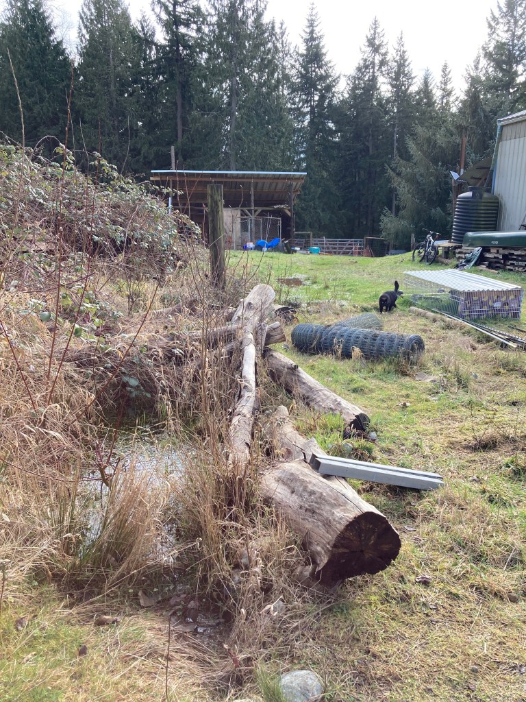 Winter rains reveal complex water systems within the landscape that are not always easy to see with the naked eye. I’ve been reviewing drainage around our chicken coop and problem solving some recent runoff spots forming around a very active space, causing mud and flooding around buildings and animals. It’s a very mild issue at present, and might be caused partially from the compaction and lack of ground cover around a summer construction area. The introduction of a trailer- rain barrier/catchment surface- which funnels the water into a concentrated flow does not help the space stay dry. Standing water on the ground’s surface is not great- though common in saturated sub-straight. I dug modest redirect ditches to keep the water out of our hay shed, and the flow only happens in flood stage rains- which are common enough in our temperate rain-forest climate to cause concern. Tracking other elements of this flooding, I followed the water in high flow and found it is also coming from the east of our property line, out of the neighboring land, where a gravel driveway was implemented without any drainage planning. This discovery, though unfortunate, did reaffirm the correct surface flow earthworks design that was implemented at EEC Forest Stewardship.