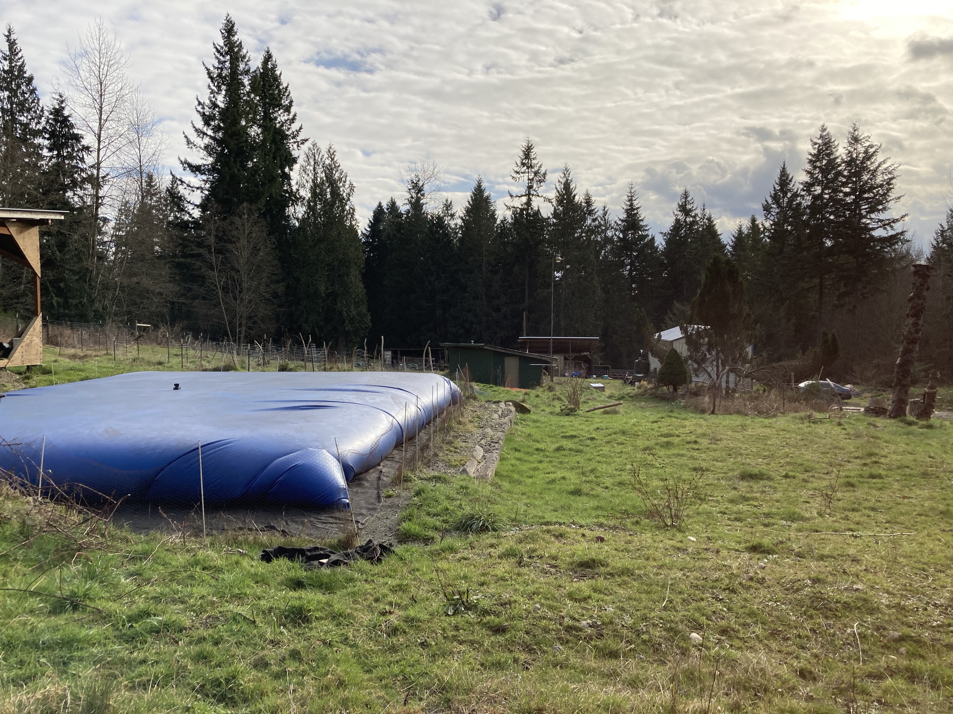 There is an established tree nursery down hill, and eventually, some of those trees will help with runoff prevention, but earthworks speed up water management capacity by offering physical redirection and storage. On a hill, it’s challenging to store larger amounts of water by digging in- in our area, the substrate is mostly gravel, rock glacial till. This terrain does not retain water well, and requires sealing. It’s another reason the water flows quickly off the land- even once under the surface. It’s best to keep adding compost to create soil, which then acts more as a sponge, soaking the water in where it falls. This is how the original old growth forest managed rainfall, especially on the slopes. That resiliency can only return with the canopy, which is why most of our land is slated to be forest once more. In the few remaining clearings, where people thrive in the sunlight whenever possible, we design alternative water catchment systems to improve vegetation and prevent erosion.