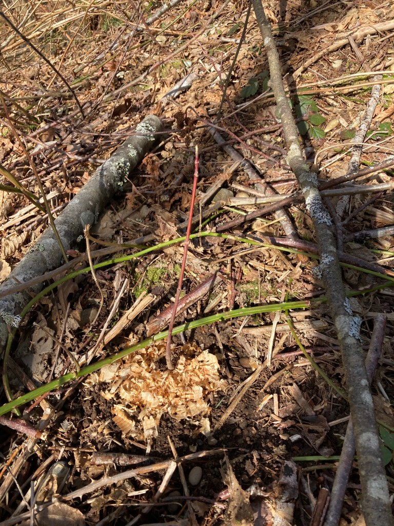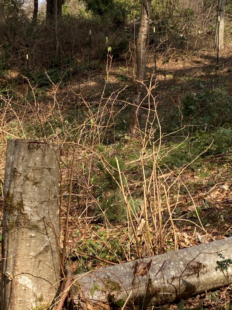 We chose Vine Maple as our dominant under-story for this small stand- small in the sense that it’s less than a quarter acre in size. It’s also a great hillside species, as it happily lays over and spreads out over any angle. Here at EEC, this species, like most of the other mid-story shrubs and small trees, were completely eradicated by intensive overgrazing many years ago. In our stream buffer, established by laws back in the 1980s. That narrow area has Vine Maple, along with other species that would remain in a protected regrowth landscape. This is also the area where my oldest trees grow. Everywhere else on the land, under-story plants will have to be replanted. No trees on our land are over 60 years old. Only a few stumps remain to remind us of the original giants who once towered above, and the under-story layer still lacks the gusto of diversity an intact forest produces.