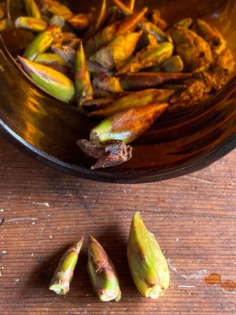 Though our landscape is degraded, it’s still supporting a verity of plants which still serve as food and medicine for their human stewards. While checking on my young plantings, I picked up a few fallen cottonwood branched with fat resinous buds. These sticky leaf buds are full of good medicine, which I draw into olive oil over a year, producing a topical antiseptic healing salve. Black cottonwoods are the fastest growing trees in our region, and often dismissed as worthless hazards. The poplar is known for shedding large branches in the middle of summer, without warning. These limbs can crush cars, puncture roofs, and even mortally injure people. Cottonwoods do drink up a lot of water, so they are great sponges in wet areas of the landscape. We have only a few maturing trees on the land here at EEC, but I don’t regularly plant them, as they are prolific enough, and given ample time to seed out on our land. Several young saplings are well on their way at this time, and a few are in need of cutting, as they develop too close to our buildings. I’ve already pulled many roots from under one of our garages, where it was literally lifting up the foundation of the structure, cracking the floor and letting in water during heavy rain events. Even with the challenges, cotton woods offer amazing habitat to animals, great water management, and medicine, so we welcome them on the land, with good oversight.