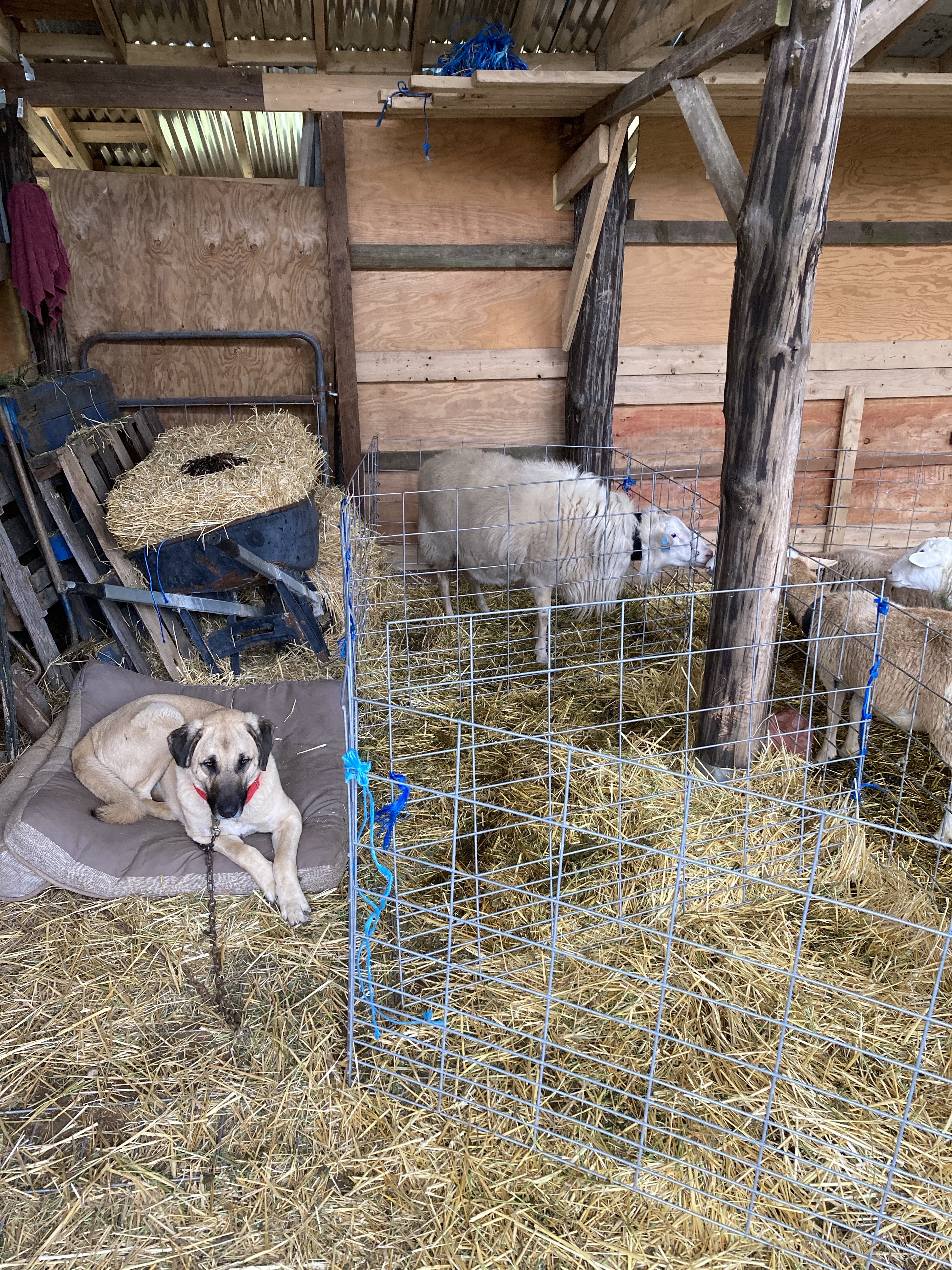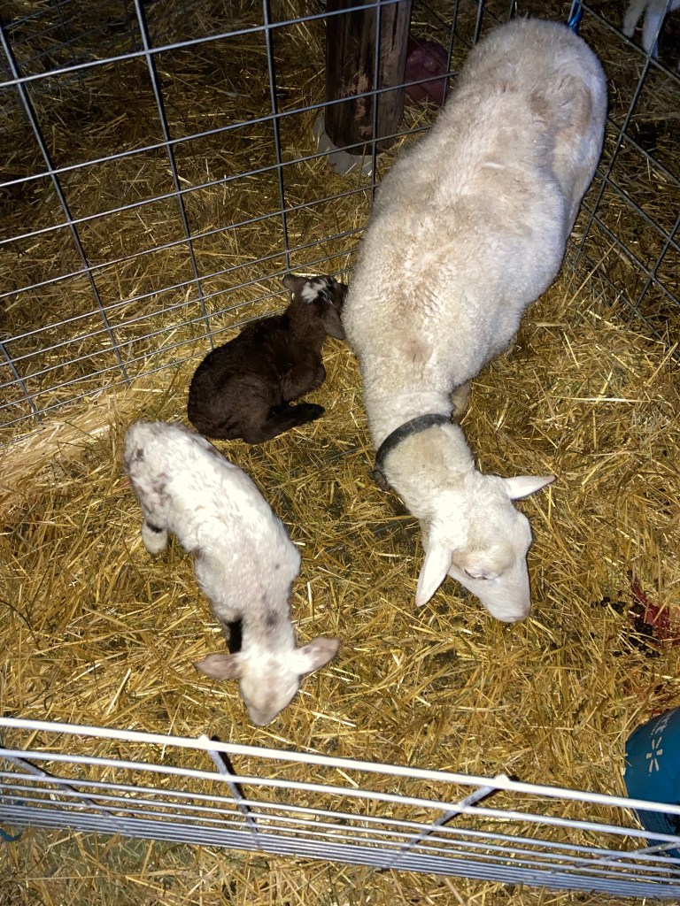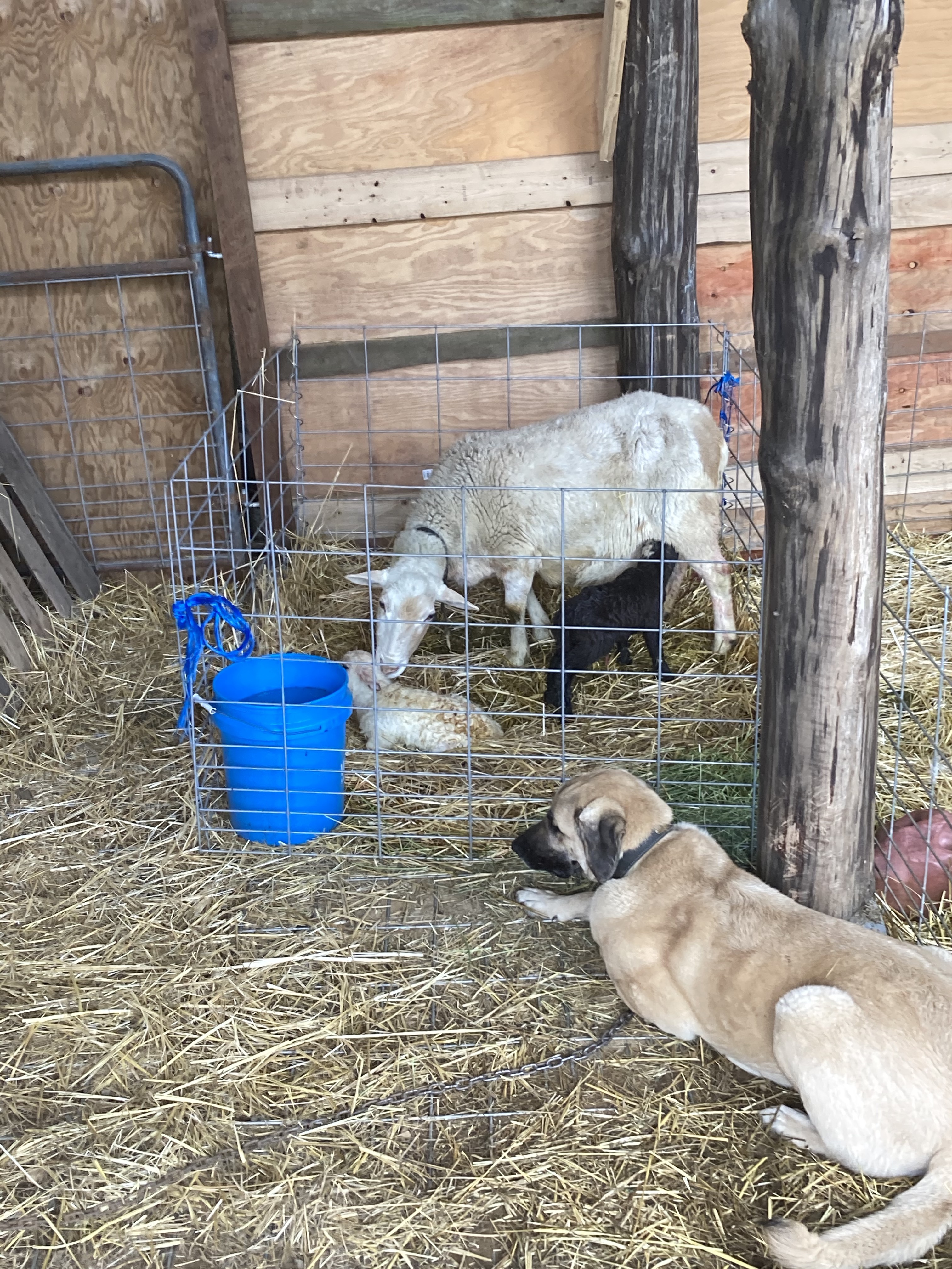 Meanwhile, Gill continued to rest in his bed, and our new ram has been watching quietly from his stall too. Hattie has her twins, and I have to get them all into a safe little pen of their own before I can go back to my own pen to rest. Both lambs are now tottering around, and that’s enough activity for me to feel good about stepping away. I isolate the new little family unit in it’s own pen for bonding, and protection from other less careful ewes. The new mamma and her babes are corralled into a pen right next to Gill. He gently licks each lamb, sniffing and registering them into the flock. Then Hattie turns her bloody butt his way, and he supports in the best way a dog can. Afterbirth is still dripping out of her, and the dog enjoys a tasty treat while helping the old ewe clean up. This ewe was raised with a Kangal at her previous home, so she’s familiar with this ritual and the dog. Gill is also bread as a shepherd animal- I would not invite you to offer the bloody butt of your ewe to the family pet- it might get ugly. This instincts and bond between the two species also goes back thousands of years. They have a trust that not all sheep and dogs can share, and that’s very important to reference in this situation.