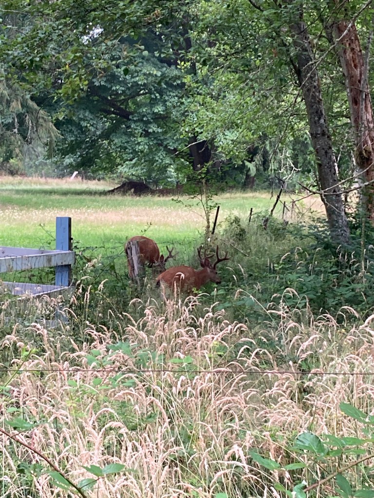 Hunting gives me a lot of insight into the population of deer in my area. I have to do a lot of observing, tracking, and sign reading before a successful harvest. Most good hunters are always watching for deer, and learning from them. Year round I look at deer, see where they move, how many hang out, and the overall health of the local herd. Black tail are territorial, like many other animals, and usually stay in a particular area once they find enough food, water, and shelter. Our neighborhood has a lot of single homes on larger acreages, allowing for the space and habitat the deer prefer. Mowed pastures and a diversity of plants along the edges to brows, are ideal for these ungulates. I’ve watched a lot of does with younger fawns this summer, but these two males are a real treat. It tells me the herd are healthy by age- mature males are a good sign that the deer can reach maturity, and support multiple big bucks. If there was not enough food or shelter, the bigger males tend to wander away into more established habitat beyond human settlement.