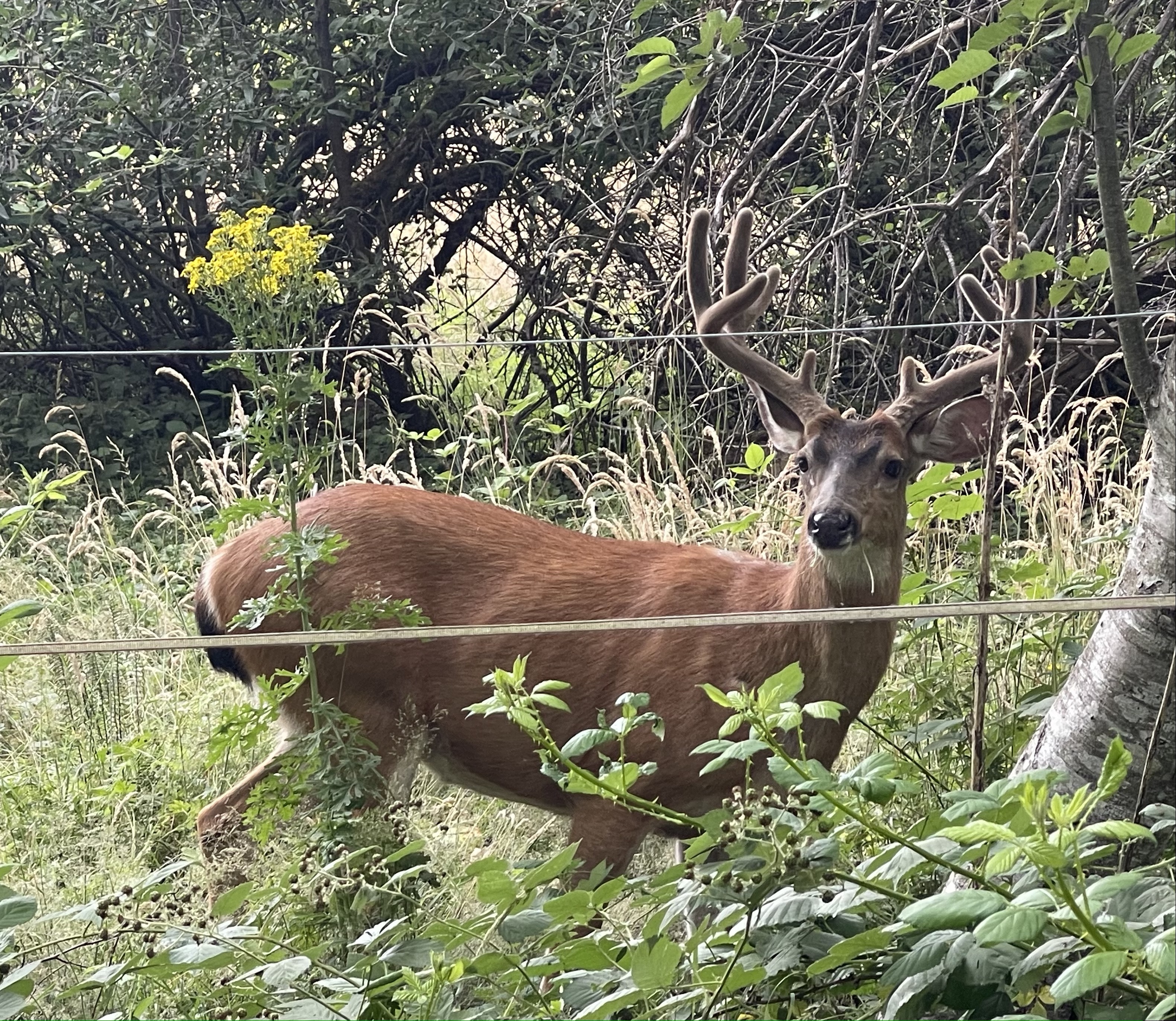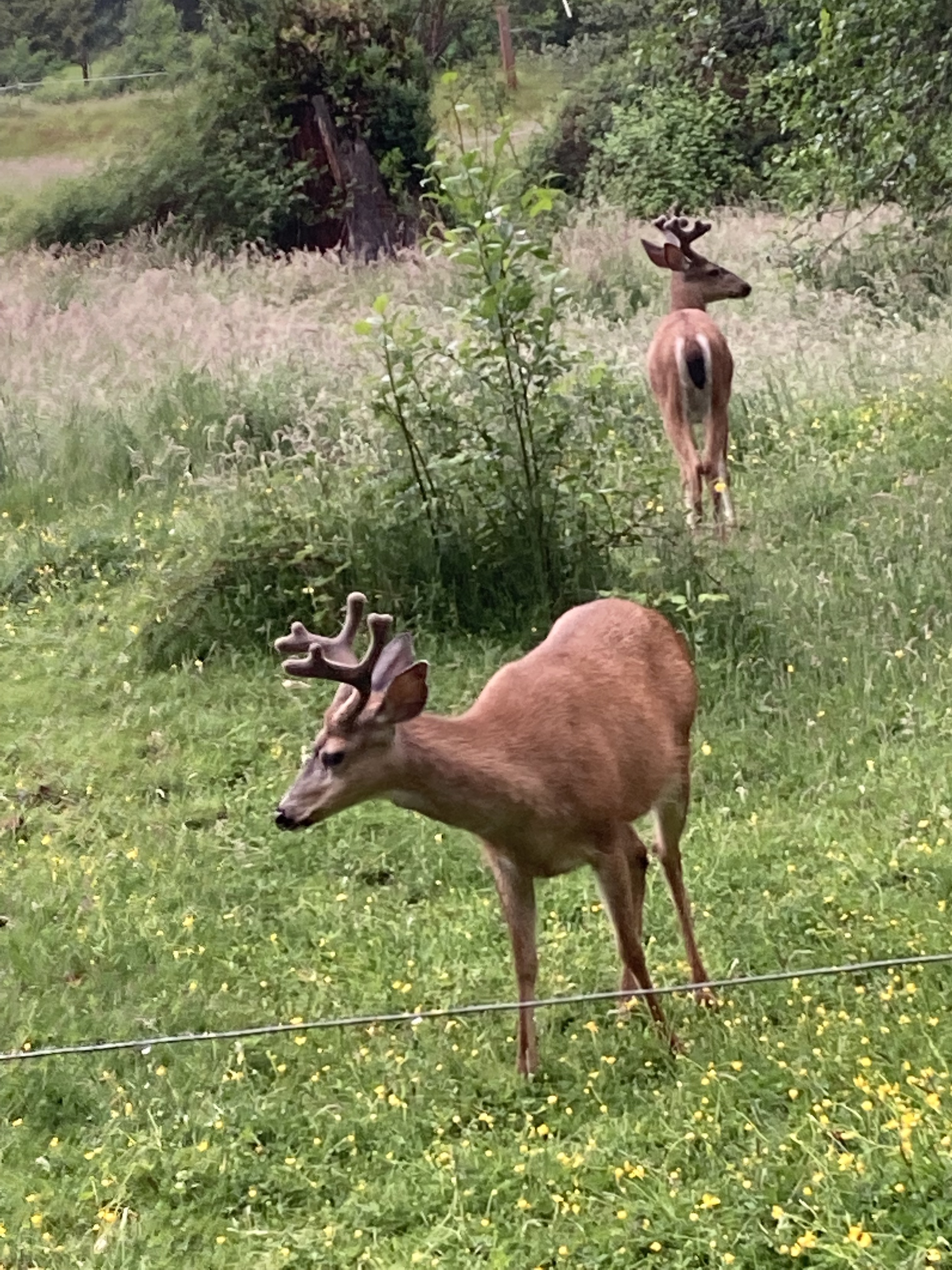 My passion for black tail lessons is entering it’s 9th year, and I’m so glad to see these two strapping bucks coming around before the season starts. If I’m lucky, they will establish this area as a territory, and claim the doe population as their harem this fall. They could be driven out by another more mature buck, but as a team, they have a good chance of standing their ground and fending off single bucks together. It’s a great strategy, and I’m not sure how often this approach happens. My observations of these two beautiful animals will continue, and I hope to have the privilege of hunting one of them successfully this fall. It would be my first mature buck harvest, and that would be a special gift from the animals I tend this land for. The deer feed me as much as I feed them, and that sacred relationship remains an important covenant with the land. It reinforces my place in the great circle of life, and to harvest wild food of all kinds- berries, greens, and meat, ties me closer to the land I love so much.
