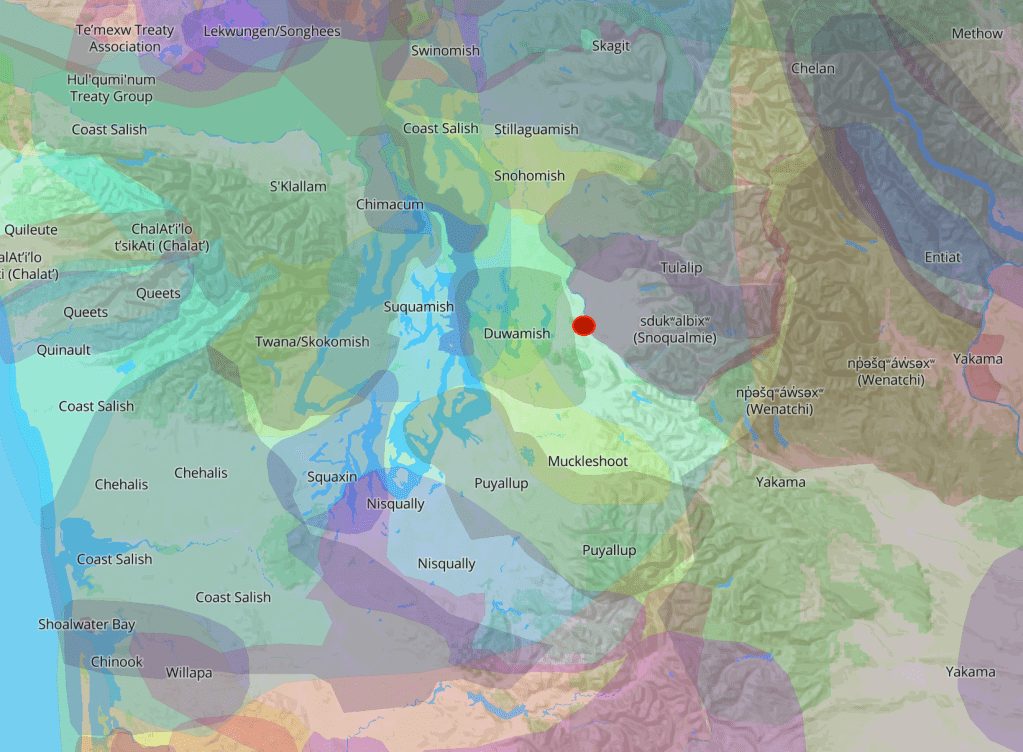 There is a movement right now to give land honoring statements at the start of invocations to honor the First Nations People who once claimed the land as their home territory. Maps like the one pictured above are usually referenced to help people find out who once lived where they are now. In checking this map, I’ve marked where EEC Forest Stewardship land is, and noted that the two closest tribes- Duwamish and Snoqualmie, did not roam on the ridge line where I now live. The light green color that does stretch across quite a bit of the map, including EEC, is labeled “Coastal Salish”. Salish is an anglicization European colonizers gave to all the “Indians” in the area after first contact with one group of Séliš, the first people to have diplomatic relations with colonizers. It was then used as a broad term for linguistic research. There is no specific “Coastal Salish” tribe.