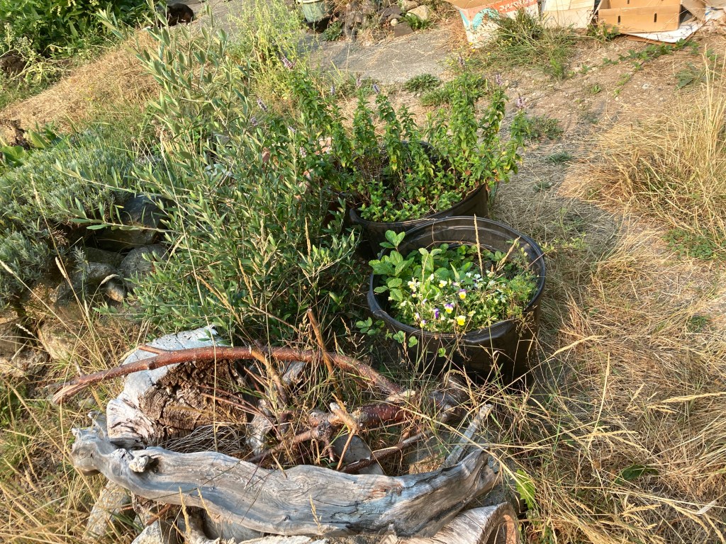 Along with the rock garden, we have a few containers in the space with more controlled growing space for evergreen mint and some self seeding pansies with strawberries. There is also a real exotic we’re experimenting with an olive tree which was gifted to us. We do need to establish a second one for pollination, but it has put out fruit before on its own. This shrub of a tree is slow in growing, and I think we should transplant it to a better place soon, though it has thrived in the rocky clay soil we initially sunk it into. The black containers also shelter the olive during the colder winter months, when reflected warmth from the sun banks into the dark material and reflects into the soil around it. When we have week long freezing temperatures in winter, the olive does suffer- not sure it will make it in the long run.