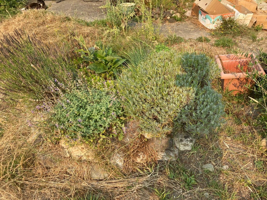 Even with the tight fit of all the herbs and planned species I’ve worked to fill in patchy space, the grass still finds a way up through the other plants, poking out just long enough to get a seed head developed for another assault. Happy to say the established plants are also growing enthusiastically, and we’ve split many new starts out of the lavender, time, and mints. Still, the weeding of grasses continued to be high maintenance, which is no good for a lazy gardener like me.