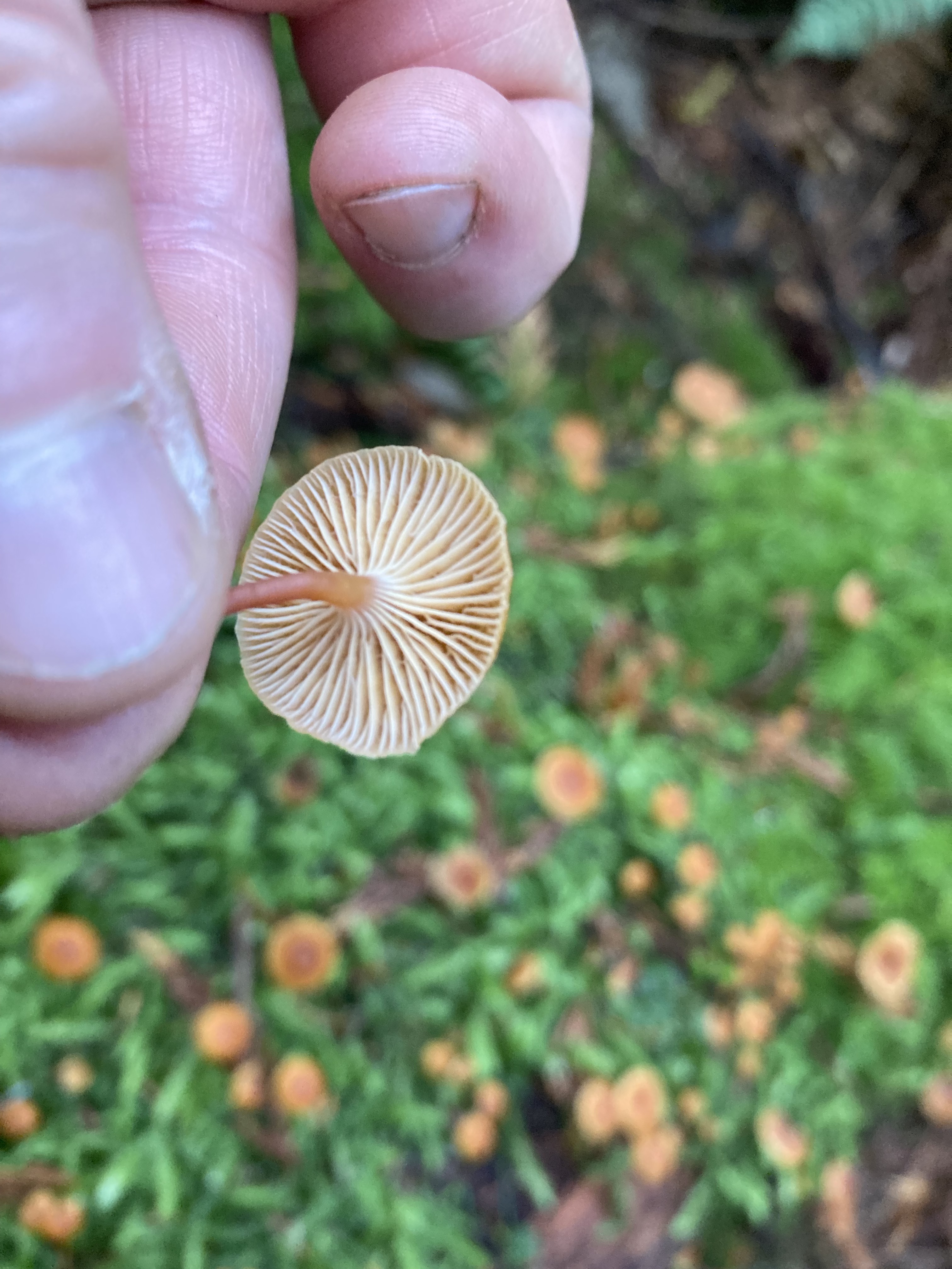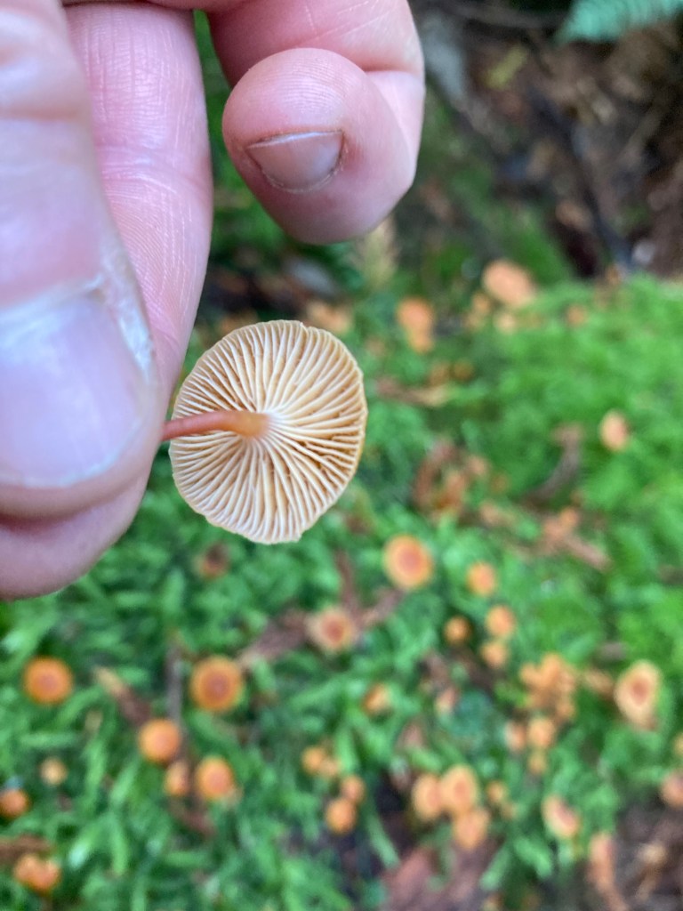 Some mushrooms are very tiny, and often overlooked while wandering the woods. Species like Mycena adscendens can be found on decaying wood, like this Douglas fir cone. The world of mycena is colorful and miniature, often these mushrooms are brightly colored and translucent. Note the viscous surface of the cap. This mycena verity also sports unique gills that are spread fart apart with exaggerated ribbing. I’m sure there’s a much more scientific way to describe this characteristic: