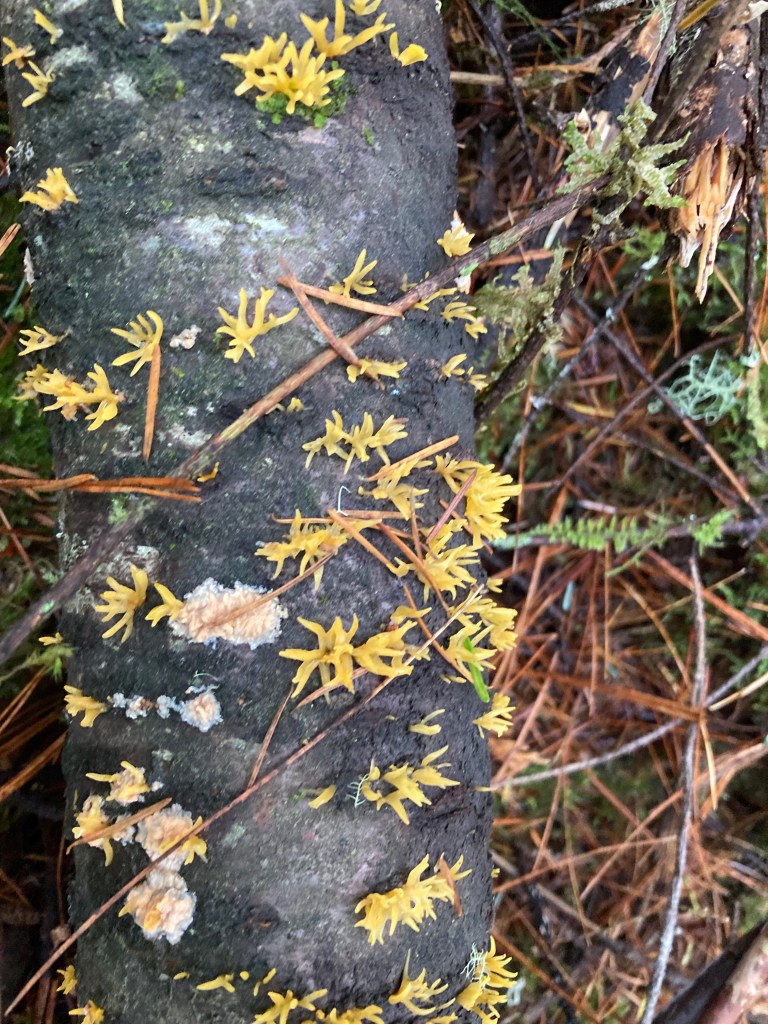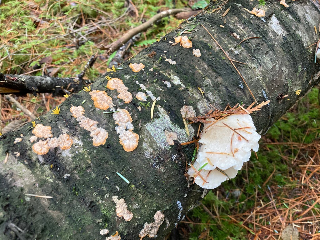 When you find different species on the same substrate, it does not mean the fungal neighbors are eating the same thing. In a sense they are, all eating this bitter cherry above, but one might be eating bark, one heart wood, and the other, a chemical only found in stone fruit wood. The cherry had some unique species, and the tree its self was a loner in that part of the forest. That made for some specialty wood eaters, and they were nearby in the soil waiting to help. Some might have been present in the tree when it was still standing, and only fruited out after the fall. The reasons for mycological inoculation varies, and many species are still under observation, thousands more lay unstudied or undiscovered. Clavariaceae coral fungi, and Corticiales crust fungi are two families which aren’t on most beginner lists, and even Trametes would confuse, though if I said “turkey tail”, more heads might nod in recognition of that family. I looked at that cherry log and knew I had a turkey tail relative in the bracket, a jelly or coral fungus with the little orange spikes, and though I did not know “crust”, I had seen the variety before on other rotting fruit woods.
