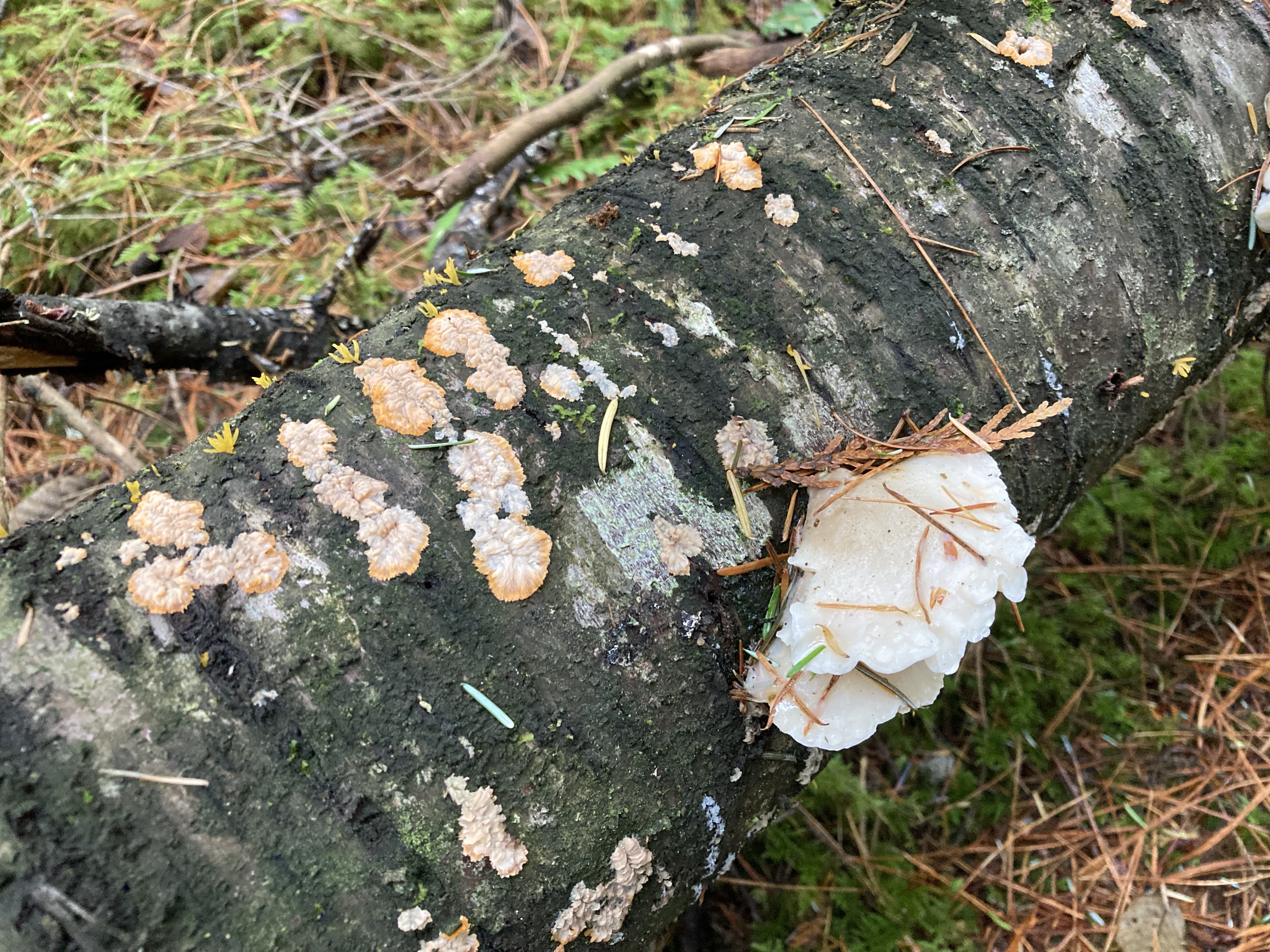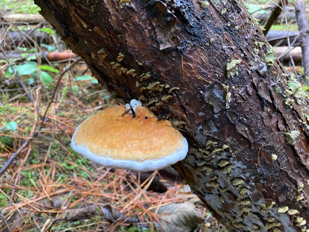 These are a classic fungal friend in most forests- hanging out on the sides of decaying logs and standing snags. The conks are often overlooked, as they are not fresh eating mushrooms, or easy to pull off their woody hosts, but they are wonderful medicinal species to respect. I’m saddened when I see beautiful Fomitopsis pinicola torn off the logs and dropped on the ground- that does kill the mushroom, and it took a long time to grow and form on the log before its life was cut short by ignorant human destruction. Please leave the mushrooms where they thrive on the stand and enjoy them time and time again when you walk by. The brackets are there to stay through the first years of a tree’s decomposition. They are paving the way for other softer species to pick up the task, once the harder resins of the wood are broken down. This example is in co-habitation with other fungal neighbors, a trait mushrooms often share- community.