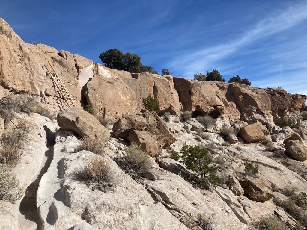 As I child, I would often explore the land in Oklahoma looking for good places along canyon walls to build “forts”. The rough sandstone often relenting to water and wind erosion, shaped into natural overhangs and hollowed out crevices which easily supported stick and debris shelters I erected. At Tsankawi, the land speaks the same language of sheltering in the rock and getting a good lay of the land from the cliffs. Human instinct is on display within these ruins, echoing the struggles of people to survive in a place where harsh conditions eventually drove humans to abandon these sacred places. In walking through these scattered dwellings and rocky paths worn into the rock over time, I sense the importance of location, cultivation, topography, and management of resources. People lived throughout these canyons in large numbers, working together to eek out crops, design water catchment to store as much rain as possible for the drought time, and good relationship with neighbors to ensure peaceful coexistence and support during lean times.