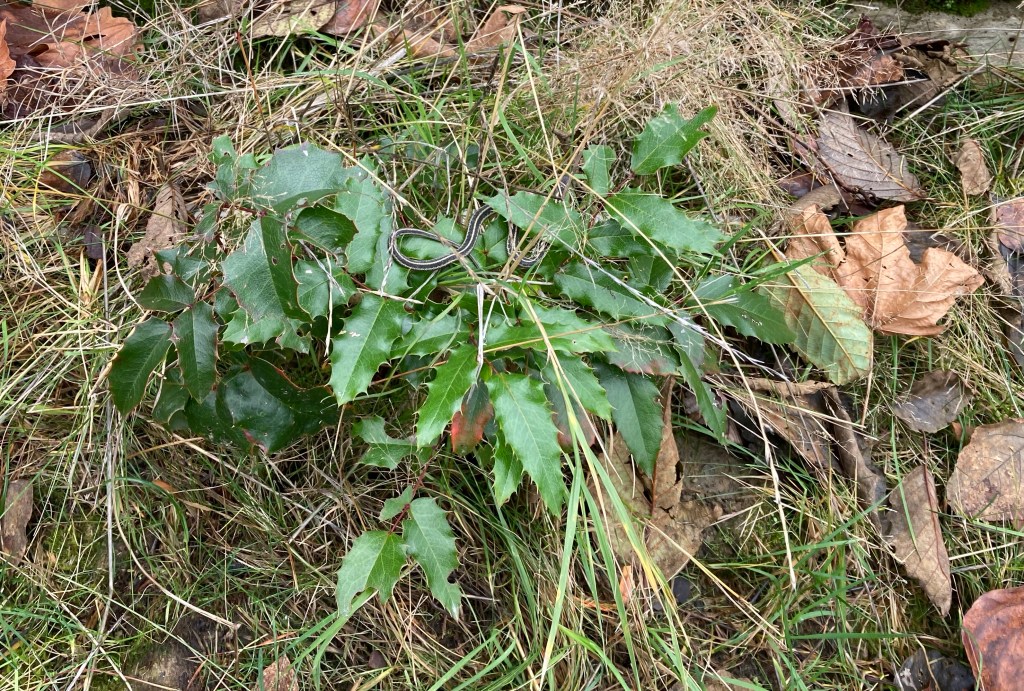 This place was once a temperate rainforest. It held vast canopies of giants, towering over a rich and thriving ecosystem that provided for millions of species. Then an over developed brain thought it would be a good idea to chop down all the trees for money and put cattle on the open fields left behind. Now the field is turning into a residential rental development. The Oregon grape pictured above was planted as part of a hedged walkway down to the river from the homes. On it rests a young garter snake. I took this picture in early December, learning only recently from a herpetologist friend in Nebraska, that reptiles and amphibians will remain active throughout winter in some regions. I’ve never seen a snake anywhere in North America during the winter. It appears that we’re having a warmer year. For the snake, this must be a confusing time. For me, it’s a little unnerving.