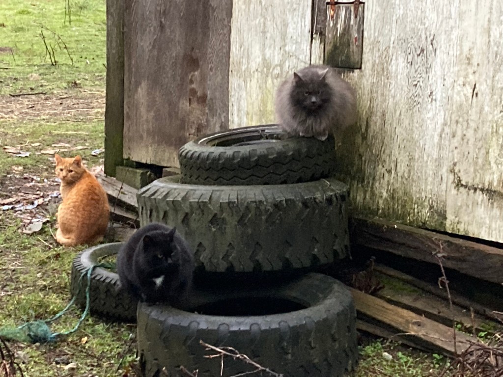 Because it was such an iconic scene- cats amongst tires- this ode to the magical barn cats had to happen. Muir, Lucia, and Marrow are all thriving here at EEC Forest Stewardship. We’re lucky to have such savvy cats on hand, for they are fierce enough to hunt rats and rabbits, while cunning enough to avoid owls, coyotes, and bobcats (to name a few threats). Being a successful barn cat in a temperate rainforest with many apex predators is no easy feat, but for the joy of free roaming through a forest landscape, and lounging on the porch in an armchair on a sunny afternoon. They ardently hunt rodents and keep the vermin at bay- leaving our grain room, barn, coop, and house, as well as the other buildings free of nibbling nuisances. Cats also hunt birds, reptiles, bugs, and whatever else peaks their interest in a moment of predatory relish.