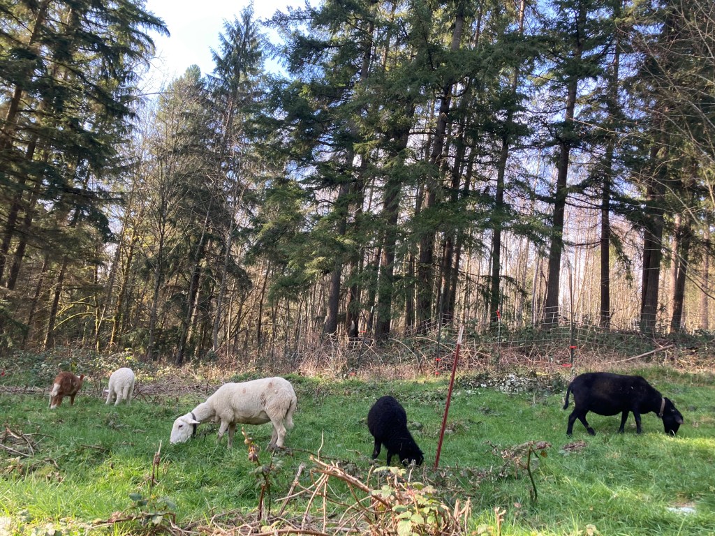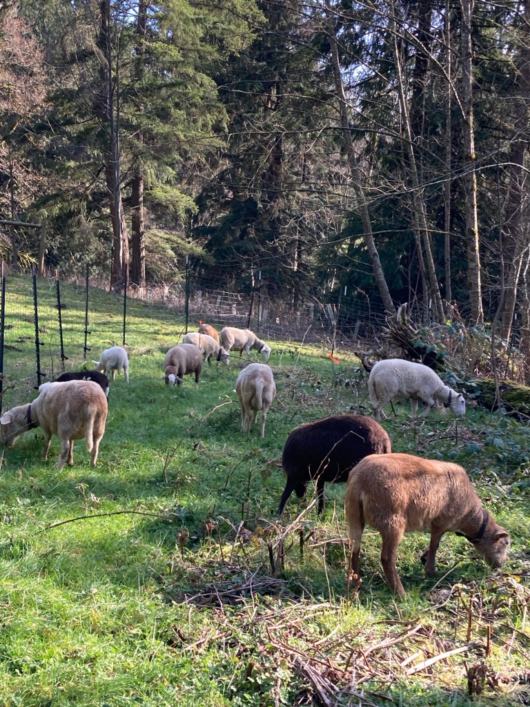 Not only are Katahdins great veggie to meat converters, they are also light hoof prints on the landscape, less impactful on the slopes our hill farm resides on. The little cloven hoof of a sheep has far less impact than larger animals like cattle and horses. Sheep are also good for the soil and restoration of the land where they are grazed properly- meaning good rotational planning to prevent compaction and ultimate degradation. If we overgrazed our land, it would erode away down the hills to the creek and there would be no topsoil left for any cultivation. Not to mention the detriment to salmon habitat in the waters below. Katahdin sheep are browsers, as well as grazers- meaning they will graze grass but they also love blackberry and creeping buttercup. Not all sheep will brows, but most hair sheep do.