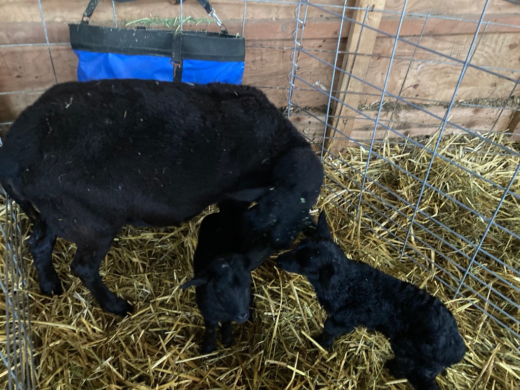 Our Cascade Katahdins are selected for twining, we do not select for triplets and quadruplets as most industrial lambing operations prefer. It is common in commercial lambing operations for the sickly lambs to be sold off as “bottle babies” at a cheap price. Though the industry would argue more lambs mean more profit, and the genetics are always improving towards that goal, the ewes are not happier for it, or healthier. Though our sheep may not drop large litters, two good healthy twins who will each get a live nipple to suckle is what’s most natural and efficient for the animal and her offspring. As an ethical shepherdess, my care is the health of the ewes and the lambs, believing in natural mothering (something Katahdins are renown for), and do not wish to stress her with too many lambs at once, or create more work for me with bottle feeding. I don’t want my ewes to end up with prolapsed uteruses or early mortality because of over-breeding to get maximum output over quality of life for all the animals.