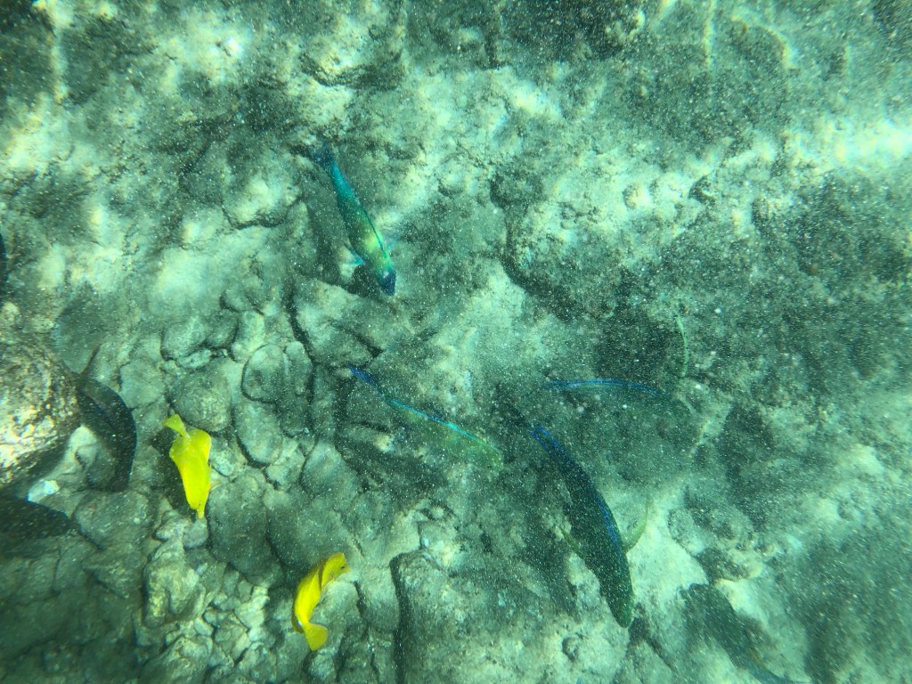 Reef health is reflected in biodiversity and water clarity. In Waikiki, the water is stirred up by commercial boats, lots of sunscreen soaked tourists, and algae blooms. The reef consists of lava rock and a lot of sand. Comparatively, Lanai is far less accessible to tourism, and receives far less human activity. Hulop’o Bay is a protected marine sanctuary, so boat traffic and commercial industry is not present. The quality of coral and marine life is far superior. However, we saw less juvenile diversity in Hulop’o, and could not determine the reason. Perhaps nursery reef was somewhere else in the bay. Coming to Lanai, we felt the fish had suddenly supersized themselves- and the size of protected habitat might have played a part in this mature school. We experienced fish schooling in larger numbers, and even witnessed a pod of 60 spinner dolphins moving across the bay on our last morning in the water. It was such a privilege to experience a tropical reef, and especially memorable for my partner, who has cultivated salt water aquarium reefs with living coral in the past, but never experienced the real thing till now.