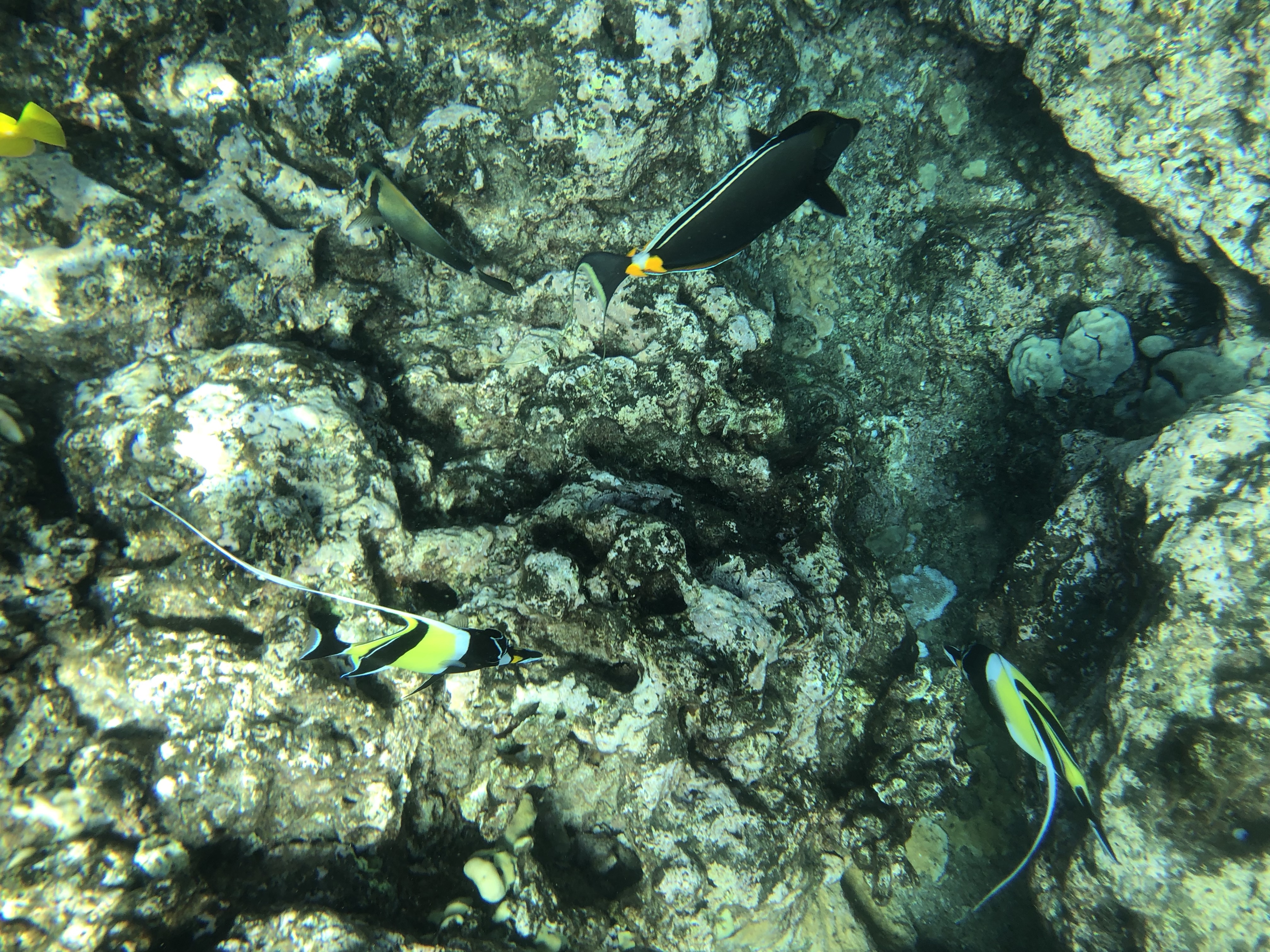 Reef health is reflected in biodiversity and water clarity. In Waikiki, the water is stirred up by commercial boats, lots of sunscreen soaked tourists, and algae blooms. The reef consists of lava rock and a lot of sand. Comparatively, Lanai is far less accessible to tourism, and receives far less human activity. Hulop’o Bay is a protected marine sanctuary, so boat traffic and commercial industry is not present. The quality of coral and marine life is far superior. However, we saw less juvenile diversity in Hulop’o, and could not determine the reason. Perhaps nursery reef was somewhere else in the bay. Coming to Lanai, we felt the fish had suddenly supersized themselves- and the size of protected habitat might have played a part in this mature school. We experienced fish schooling in larger numbers, and even witnessed a pod of 60 spinner dolphins moving across the bay on our last morning in the water. It was such a privilege to experience a tropical reef, and especially memorable for my partner, who has cultivated salt water aquarium reefs with living coral in the past, but never experienced the real thing till now.