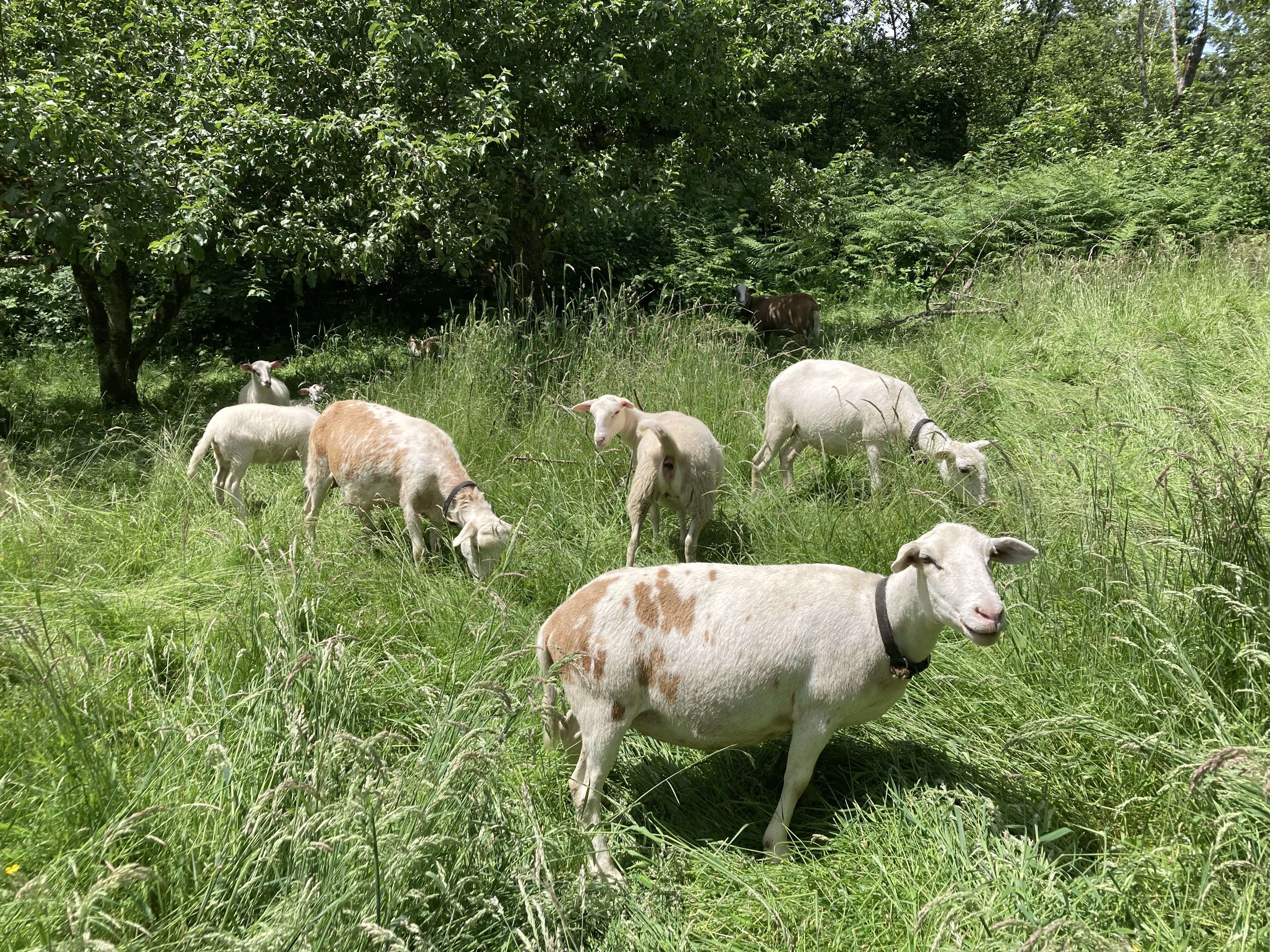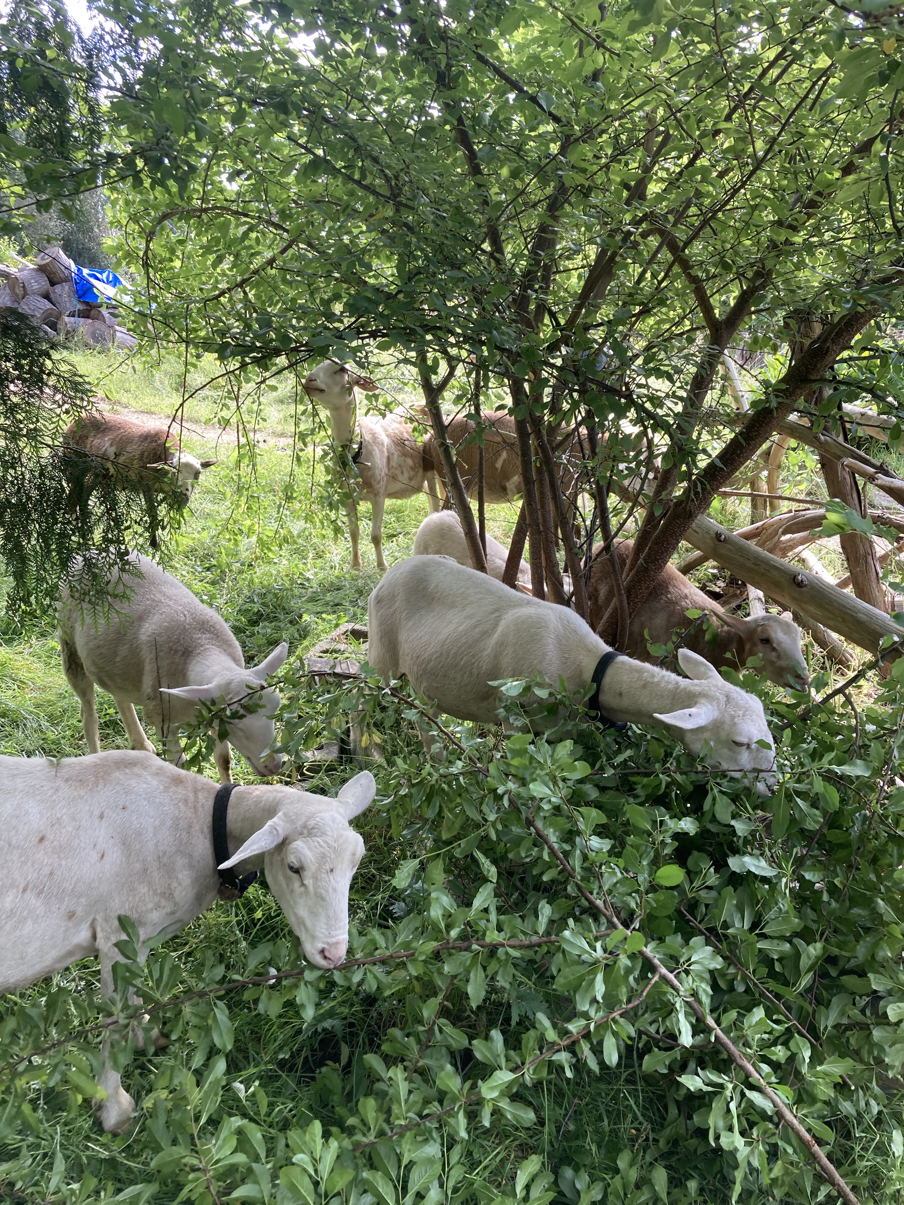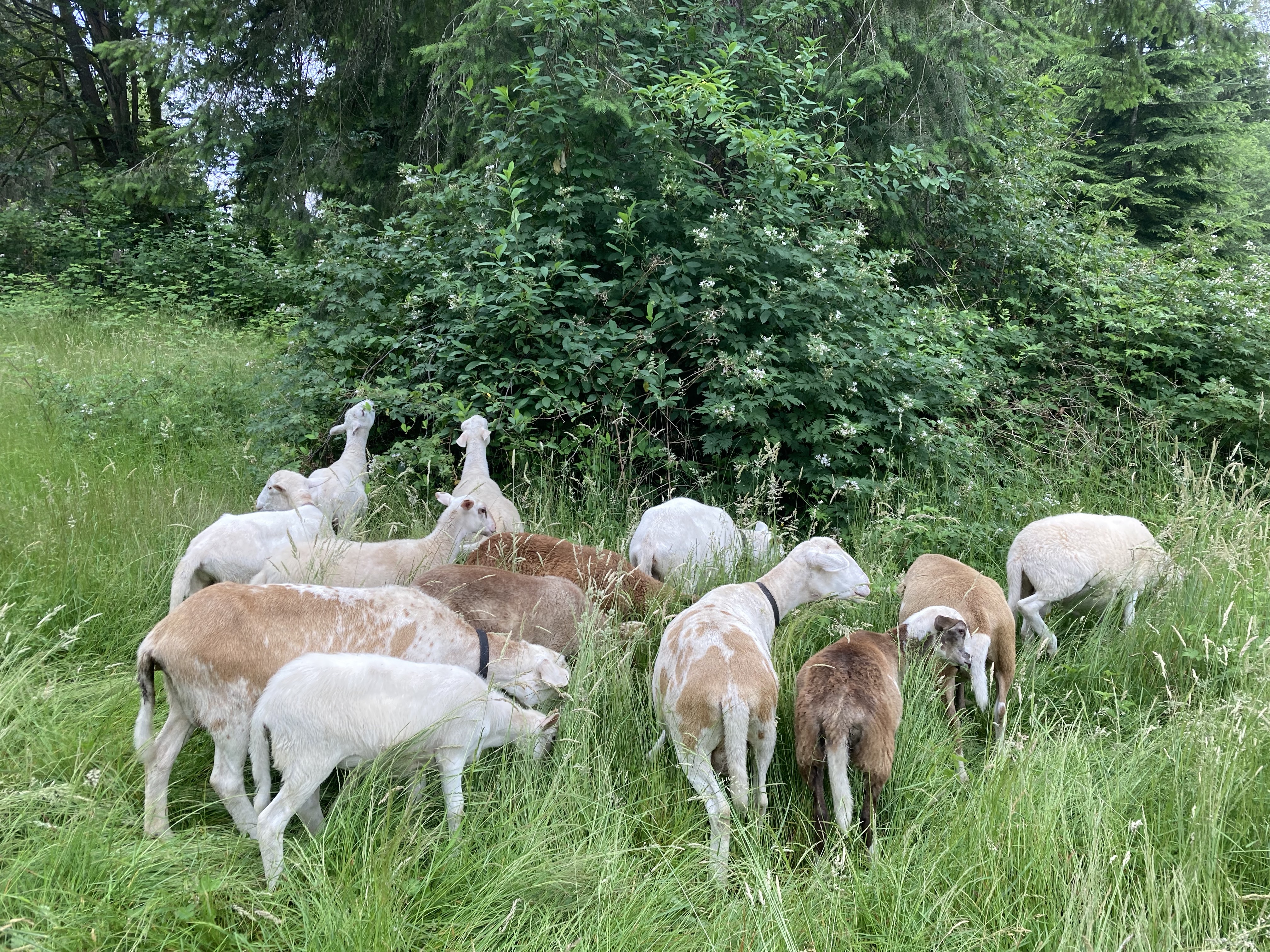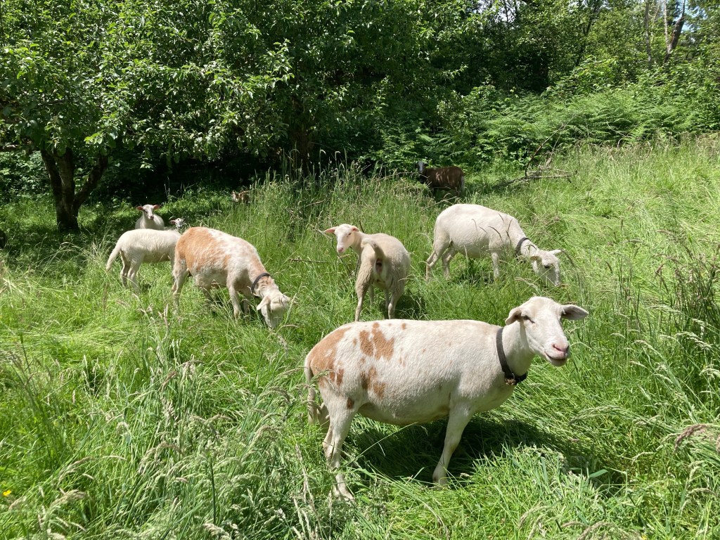 If EEC were to stop using sheep tomorrow, we’d have to do a lot of mowing and replanting of forest fast. The Katahdin sheep do very important work keeping land clear, and meat on our table and those of our dear patrons. They are also sewing endless fertility in manure for the soil, and thatch for carbon boost and water retention. The mower can’t add manure fertility, it’s only chemical output is toxic- and we’re still using a few two stroke engines, but not all the time. If the sheep have access to grazing, they are eating. A good flock will happily munch into darkness and rise again for a midnight snack during the warm dry summer months. Right now, July 2022, our flock is in the back pasture busily grazing grass and blackberry. The lambs, ewes, and rams are putting on good weight. Weening and breeding are in full swing, as peak abundance arrives.