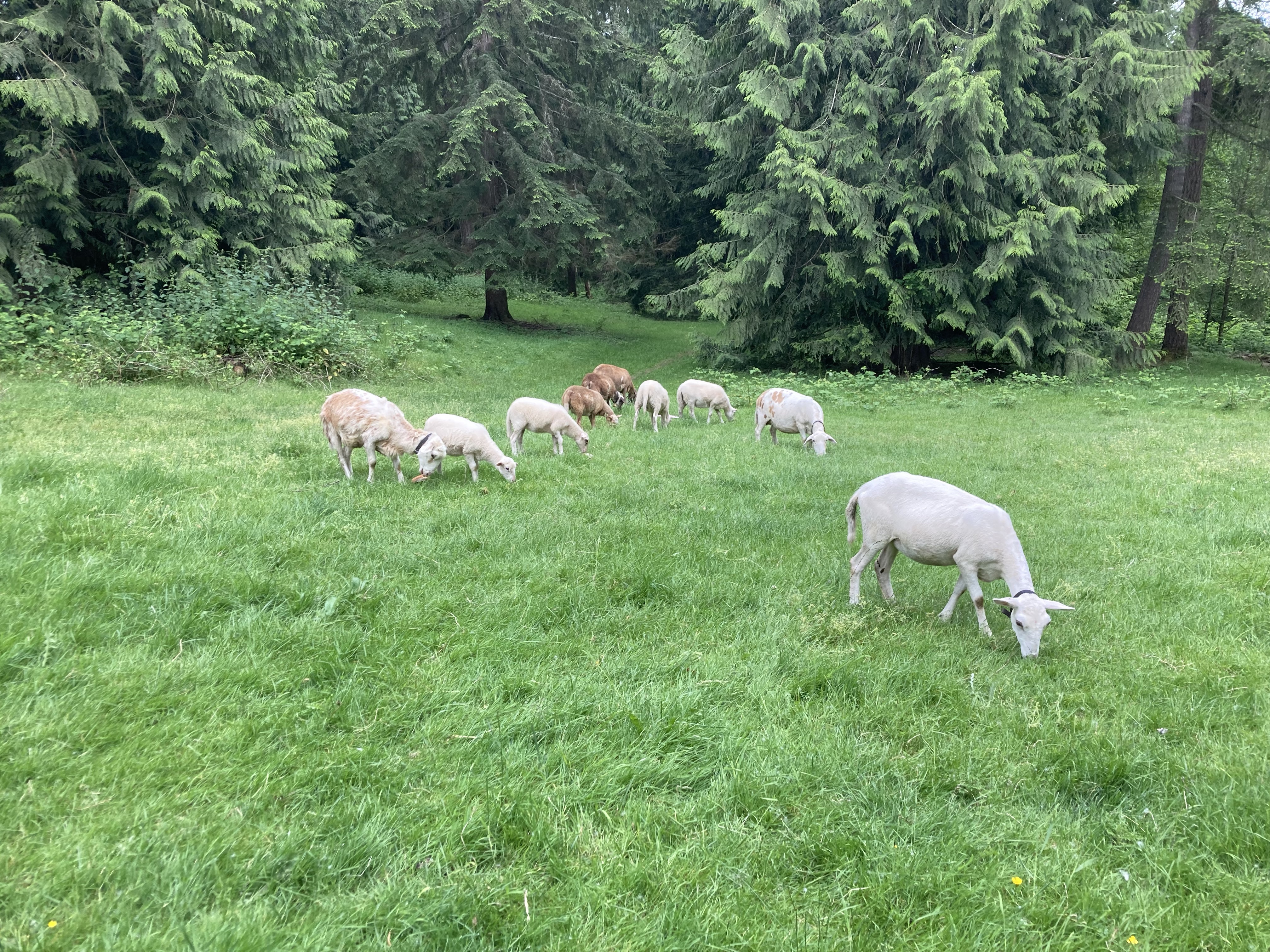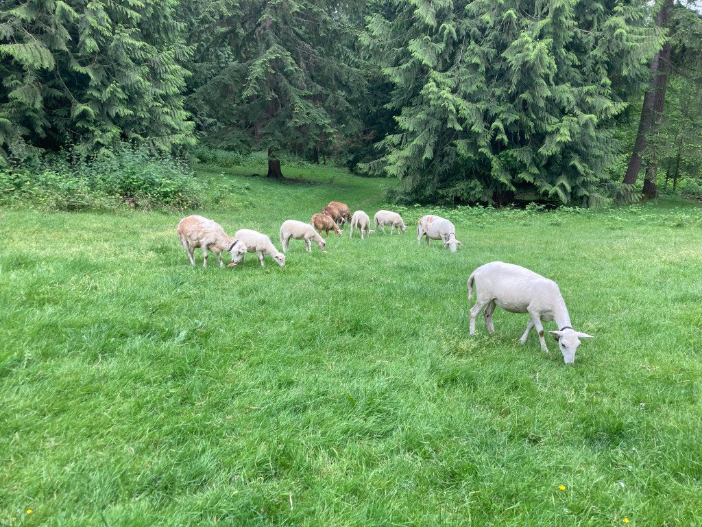So, are the sheep kind of the same thing? Oh yes, they are a sad mimic to elk, deer, and wolves. Our dogs don’t chase the ungulates out of lowlands. Though Valley, our Aussie mix, is a great herding dog who does move the sheep off old pasture and onto new, much like her wild cousins. Only having 13 sheep and a few acres is limiting, but our rotational plan and animal numbers keep a fine balance of ecological health and food production. That food is meat, fruit, and vegetables. Ecological health looks like native plantings, temperate rainforest restoration, as well as the preservation of clean soil and water. All are in play, with or without human “stewardship”. But we’re here, and cultivating change, both productive and destructive. Livestock can be incredibly detrimental to landscape and its delicate ecology. If left unchecked, and degraded landscape will collapse under animal predation.