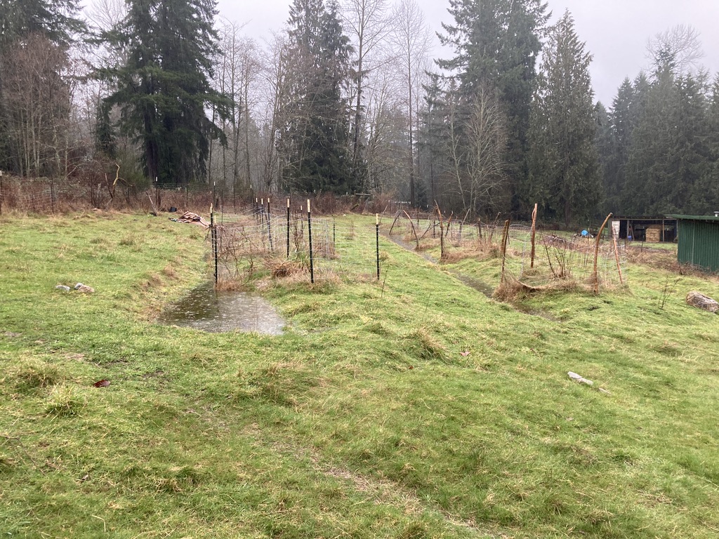 Working with the landscape like this takes a lot of planning, observing, and mapping of your topography. Moving water across contours can be a tricky thing, that’s why we focus on sinking the water in, not sending it away. There are strict laws here in King County Washington regarding moving water across your land, especially if your sending it off your property onto someone else’s. That’s against the law, and with good reason, imagine what would happen to people living far below someone directing all their water down hill? Flooding out your neighbors is a serious thing, and the laws protecting against it are very important to be aware of- especially in a region with a lot of rain. As the weather becomes more and more extreme, we’re seeing first hand the volume of water increasing across our property. Last year, our well established swales filled to the brim for the first time. Luckily, they are built to overflow into each other and down to the pond, which has never reached it’s outflow capacity. If it does, there is a catchment basin below and a slow meander down to the creek on our land. There is also a backup overflow basin off the pond, which could hold additional flooding in a major weather event. So far, we have not come close to this kind of event, but we’re prepared none the less.