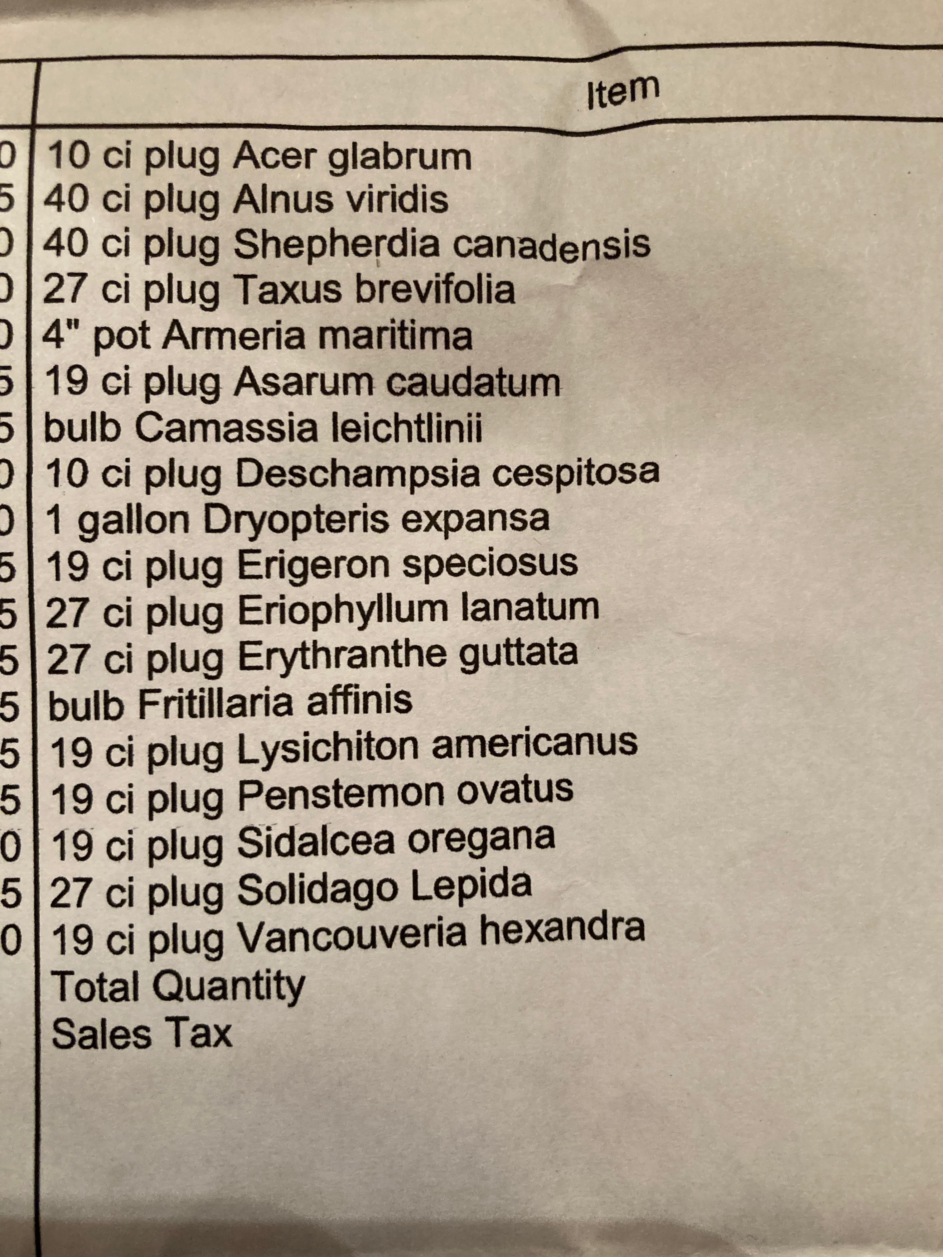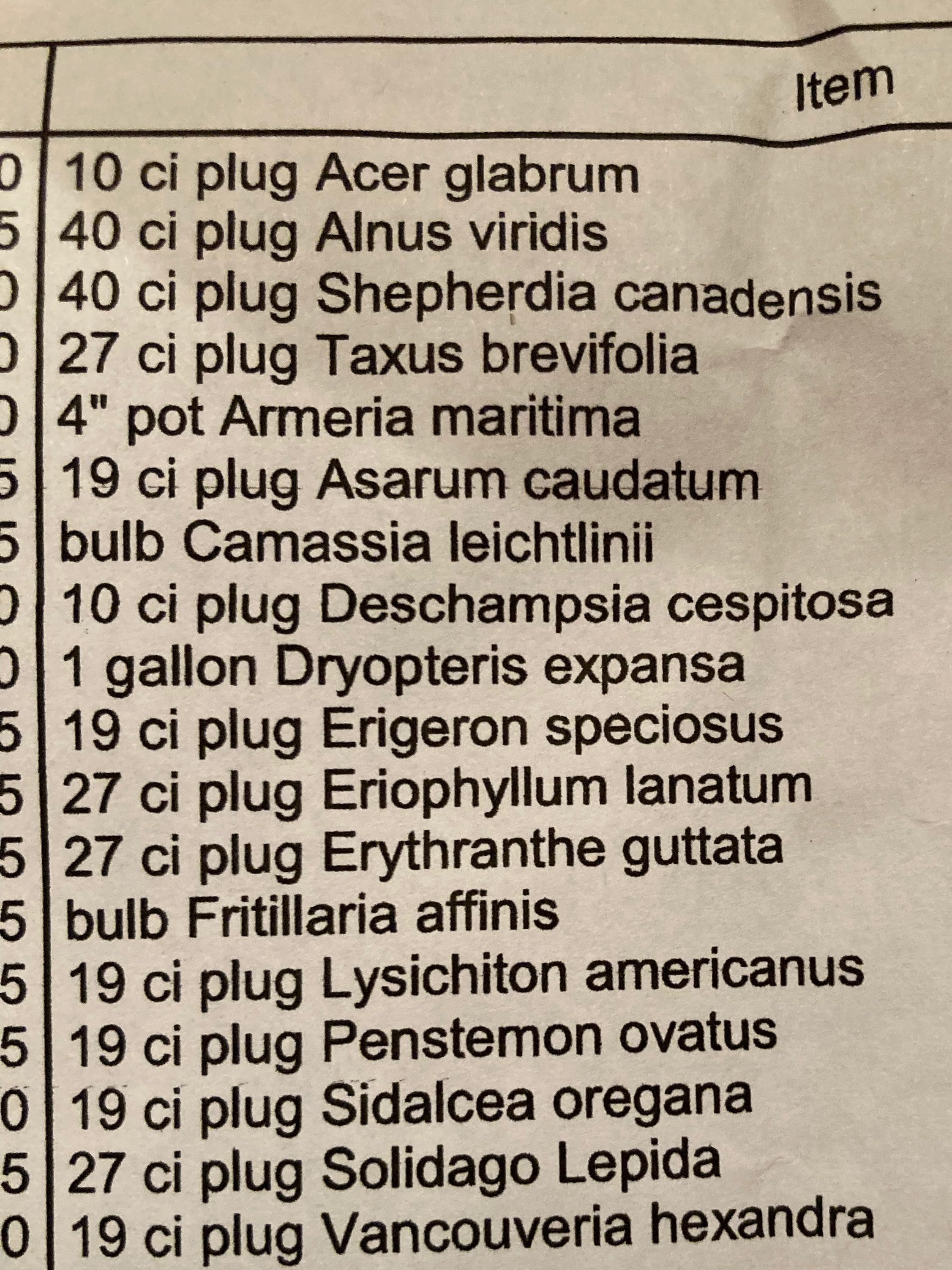 For years now, most of our native replanting stock has come from Native Plant sales- usually hosted by our local conservation organizations. But in the past few years, these sales have run out of plants early on, and not offered enough diversity for our restoration ambition. Oxbow was able to source an impressive variety of species- especially ground covers. They could also offer larger bulk numbers, which fits in with my over-planting scheme. This fall’s order was the largest, with about 400 individual plants in 18 species. What a range! Some, like Acer glabrum, Douglas Maple, should be common in our area, but you can never find them in a native plant sale. Others, like Anaphalis margaritacea, can be identified along most logging roads in clear-cuts late summer, but have been quite a challenge to establish. All are nestled safely in for winter, and hopefully we’ll have a lot of new growth at EEC come spring.