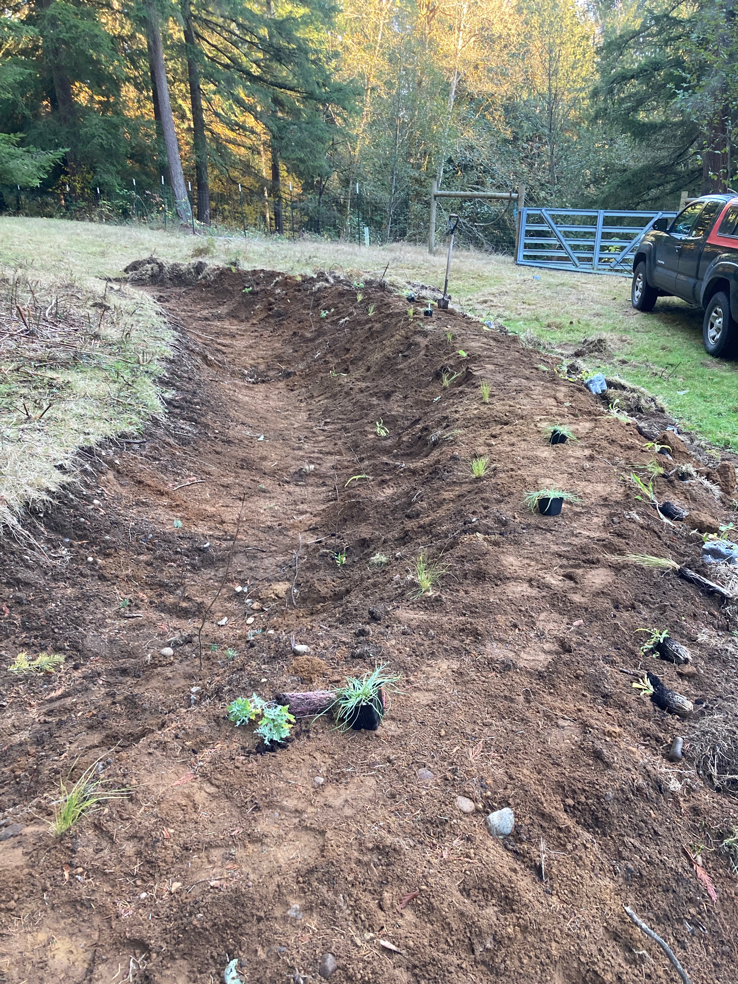 I’ll plant, plant, and plant some more. Move some earth to slow the water back into the soil. Roots go down, down, down, into the ground. My lifetime is now rooted here, what privilege, and the gifting back, returning- this is an honorable vision, a righting of wrongs. I did not cut the trees here in 1900, but others like me did, not The Snoqualmie Tribe. The Lushootseed speakers continue to weave their lineage, around all the colonial baggage coming in still. Be proud of ancestry, but also recognize the history you’re woven into so deeply. We’re all in, like the forest, full of many kinds of plants and animals form all over. But the invasives have changed this place forever, and not for the better. Please acknowledge this truth and start the healing. Plant love, seed learning, and harvest understanding through the whole process. Growth takes time. Another swale, more grasses, shoots, and leaves covering bare earth. Scars across our hearts will keep the memories of what was, and what can be again.