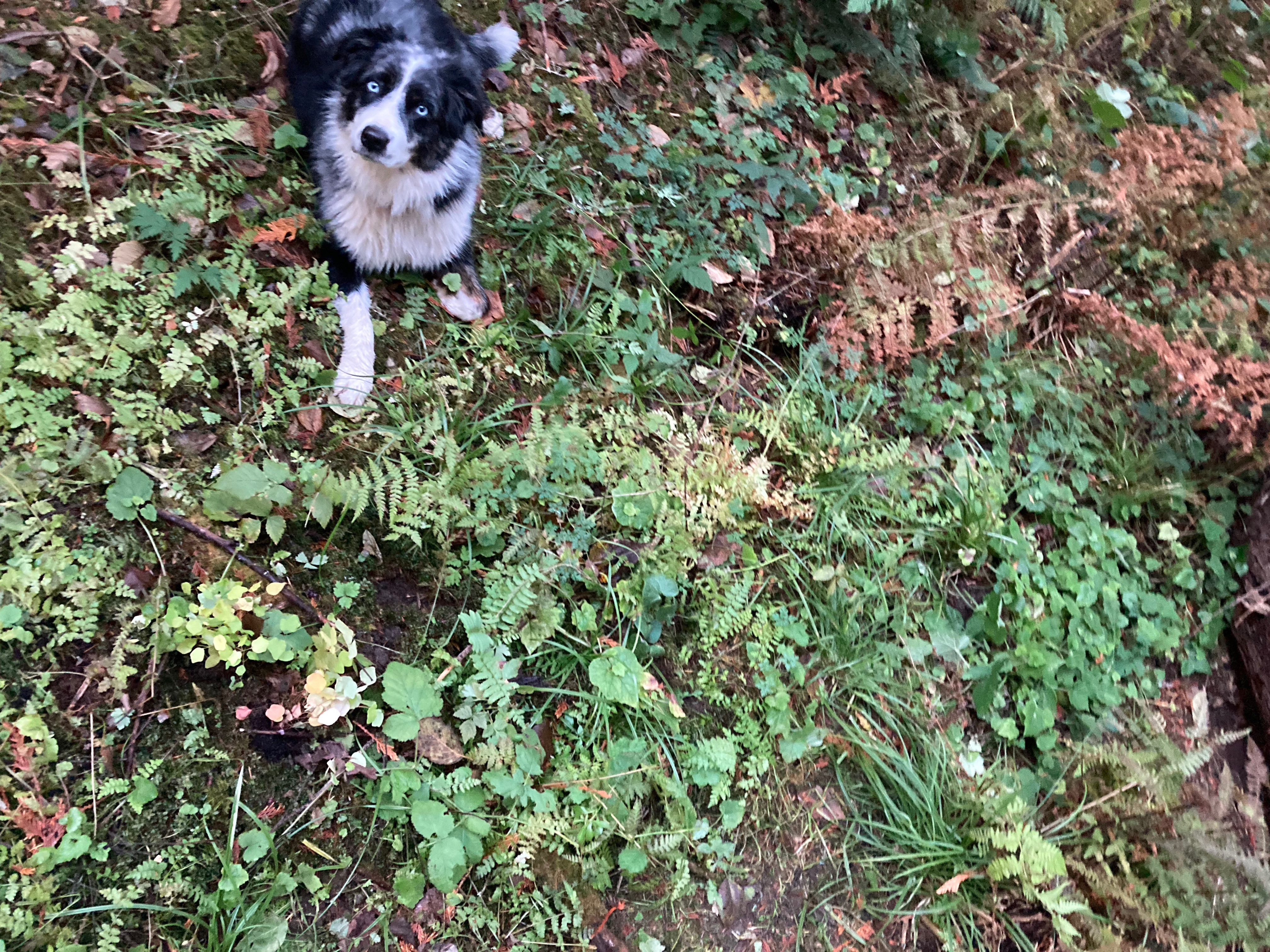 Distributing these “plugs” around the landscape took some good mapping of ecology to make sure each species had its correct climate needs. A lot of plants went into our protected CREP area by the creek- wetland species like wild ginger were tucked away in the thick bramble to protect them from deer predation. It was still very dry in the soil in early November, but established species in the wetlands helped identify where new wetland friends would best live. Valley, our Aussie cross lays at the edge of one such planting. See how many verities you can identify- including the ginger. There are three fern types too. The sedge let me know this was a wetland area. Rushes are also helpful guides in finding your wet ground.