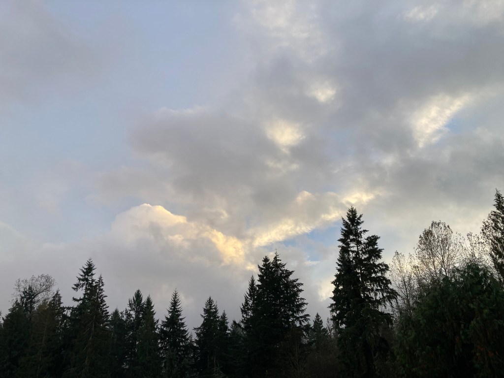 The gaze is often drawn to warm tones, especially in this place of evergreen moss and dark, wooded groves. Fleeting visions of fiery shrubs and electric green broad leafed ground covers in the garden- even the old tin roof seems to glow with the changing western sunset. Moisture in the air extends the pantomime of color. Clouds spread golden rays out of a late Turner feeling sky. Another spectacular impressionistic sky by Mother Nature. This particular landscape in Western Washington has enough open clearings to offer skyscapes. It’s surprising how often we forget to look up and appreciate the heavens. Often, throughout most of the day out skies remain overcast and grey, but when the clouds part, a cascade of pigments abounds. Dramatic cloudbursts climb over the trees chasing the winds far above. Sunset catches across billowing tops, spilling into forest crowns, gilding them majestic gold. These shows come and go quickly, so take a moment as the day opens, and another at it’s closing to appreciate and applaud natural light at its most active.
