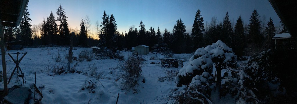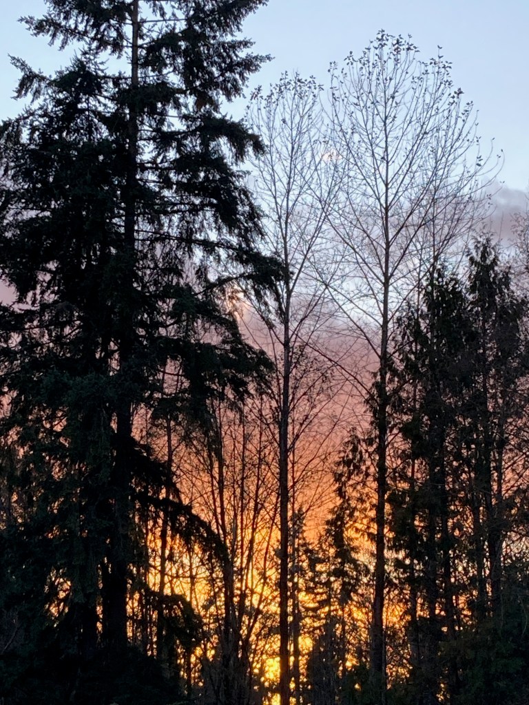 We live 30 miles from a large body of water, and 150 miles from The Pacific Ocean to our west. This makes sunsets amazing, and the afterglow lasts after the sun drops behind the horizon, continuing to reflect form vast waters. Often, lavender tucks into peach watercolor flames. Silhouetted evergreen giants lean towards western winds, whispering evening chorus into light’s last symphony.