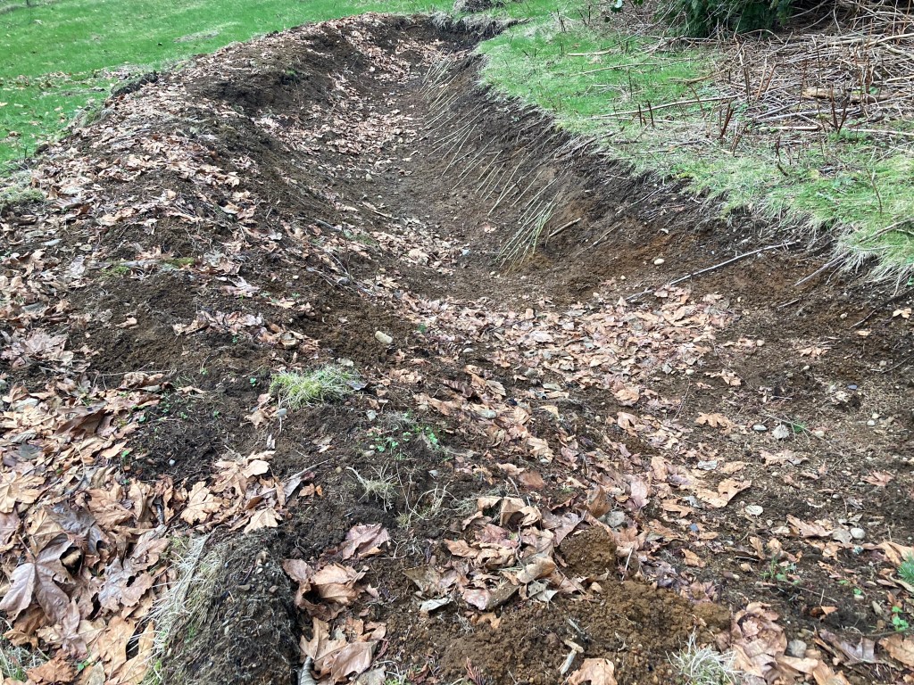 New earthworks update and new plantings abound at EEC Forest Stewardship. We’ve been monitoring water across the landscape and establishing new willow stands for future crafts and medicine. In late winter, willow starts- cuttings of stem about 3/4″ thick and about 18″ long are sunk in the swale to establish hold on the upper bank. Over the next few years, we’ll be adding debris in the swale to build up mulch and soil for the plantings. The down hill and south facing sunny side of this swale is planted with a verity of other native ground covers and trees. The next phase of developing this space will be soft fencing- electric mesh, which will be hot when the sheep are in this hard fenced pasture this spring. Guarding new plantings has always been a challenge. Even our LGD Gill is known to dig up a recent planting in fun and mischief. It could also be the alluring odor of fish emulsion often used to bolster starts.