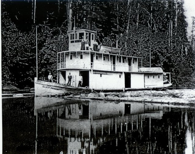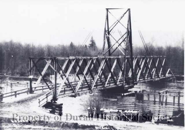 Black Prince steamboat on the Snoqualmie Cherry Valley Swinging Bridge, Duvall, WA 1909