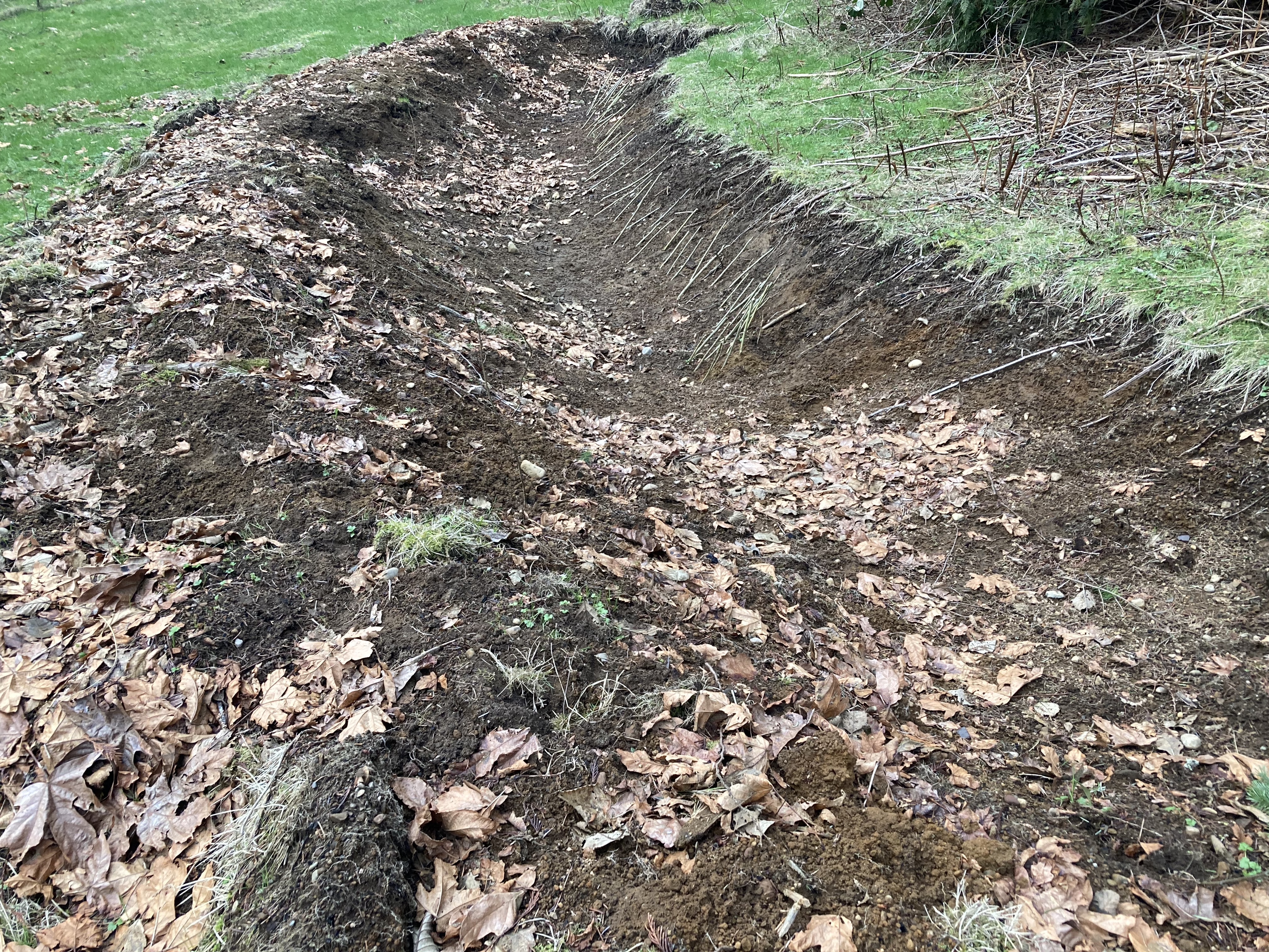Dips and mounds across the landscape create more surface area for growth and catchment for moisture. The micro-climate diversity formed by cold sinks and sun traps on south facing slope offer another layer of diversity in ecological possibility. Shore pines tolerate late summer drought while willow will soak up moisture and hold the sloping terrain. You’ll often see old willow in active floodplains laying over on their side, completely re-rooting along the trunk and throwing up countless suckers which develop into new trunks in time. The willow stakes are placed leaning in against the bank they are closest to. This bank is on the north side of the swale, so the willow will want to grow downhill, towards the light and away from the bank, but the initial root set will encourage the trunk of the future tree uphill, into the bank for additional long term rooting. I’ll control this optimal shaping with pruning for the next few years. The plantings in the downhill mound will also grow up and shade out the south side of the swale, forcing the willow up to remain in the light.