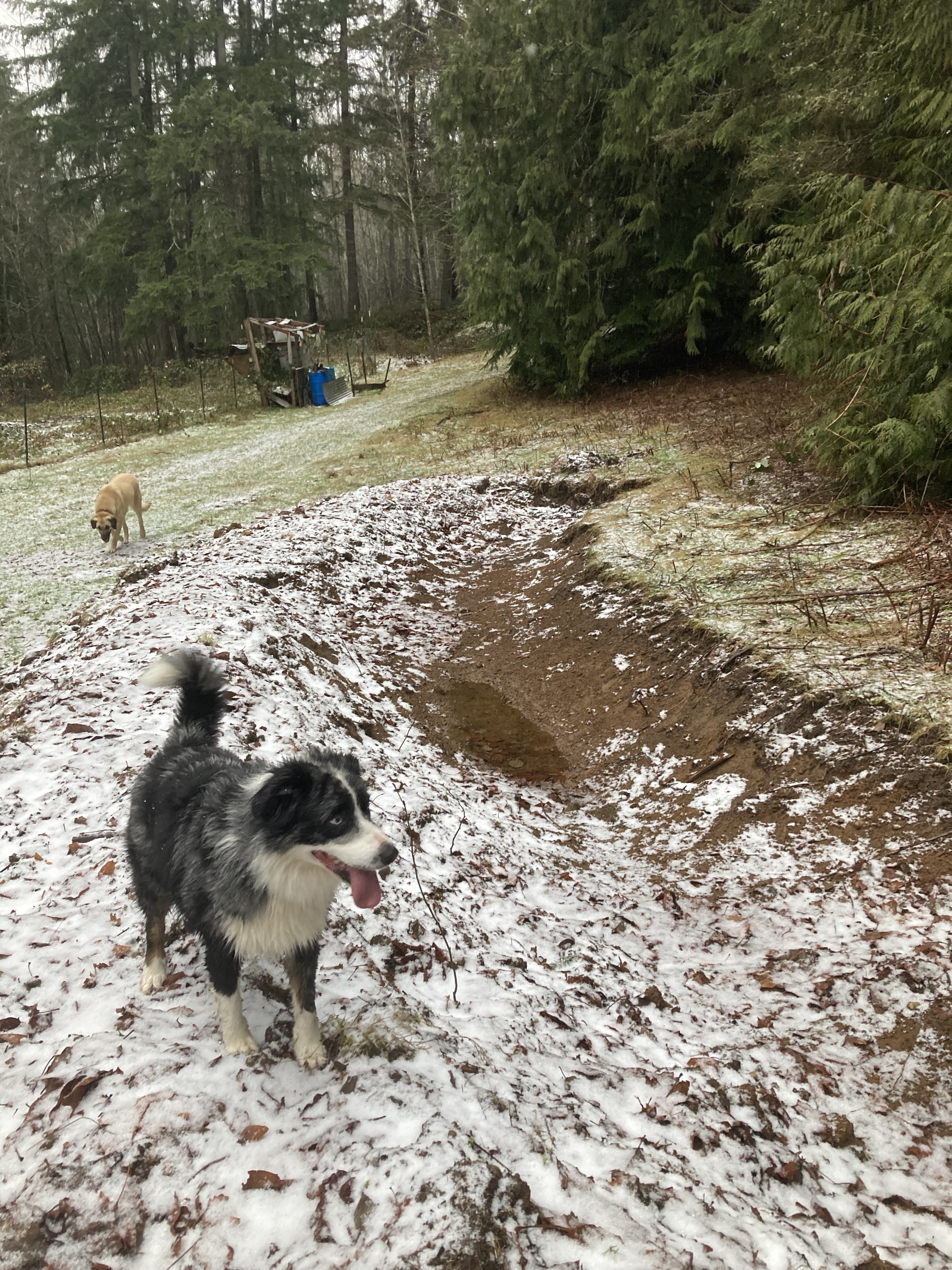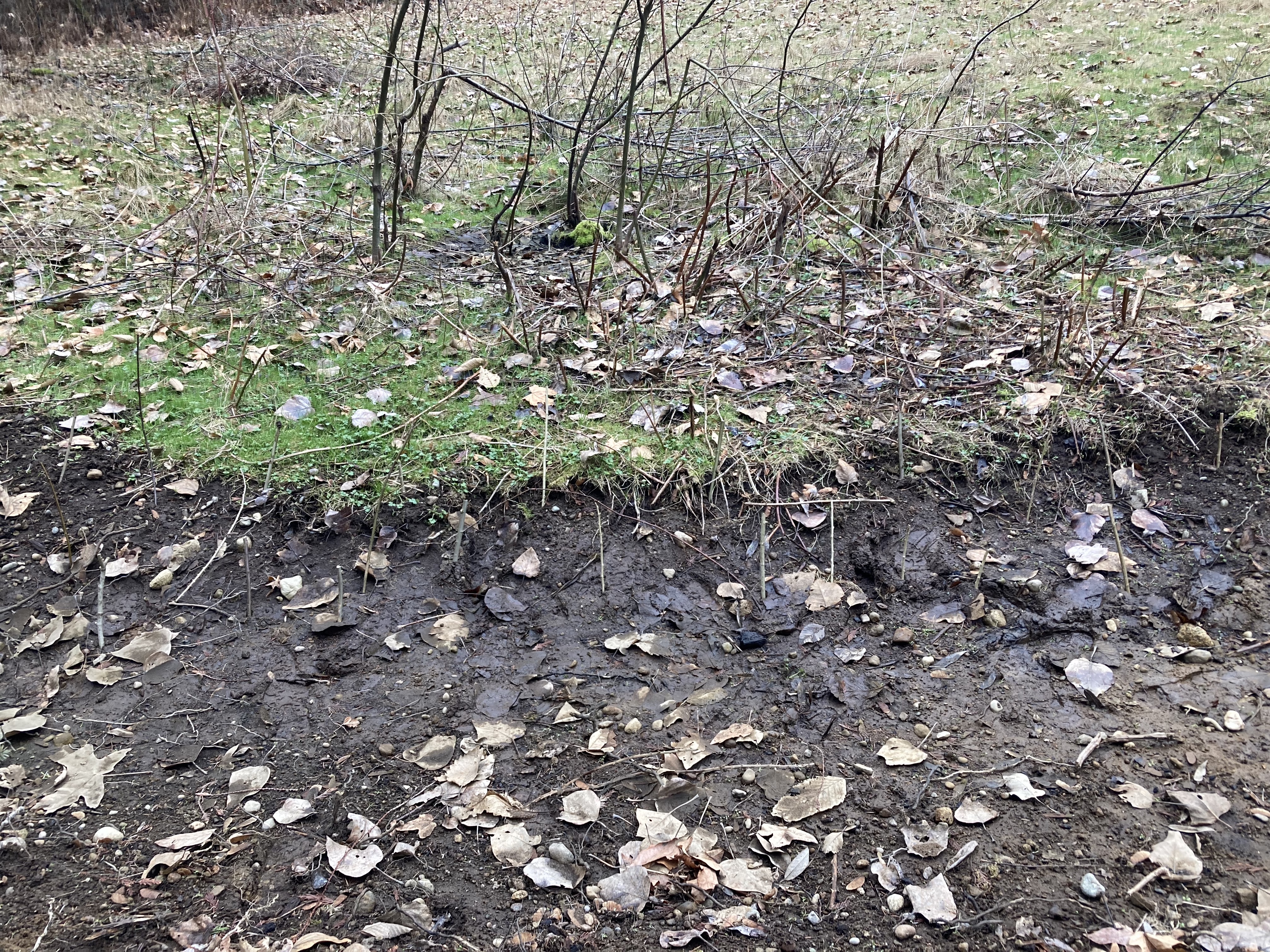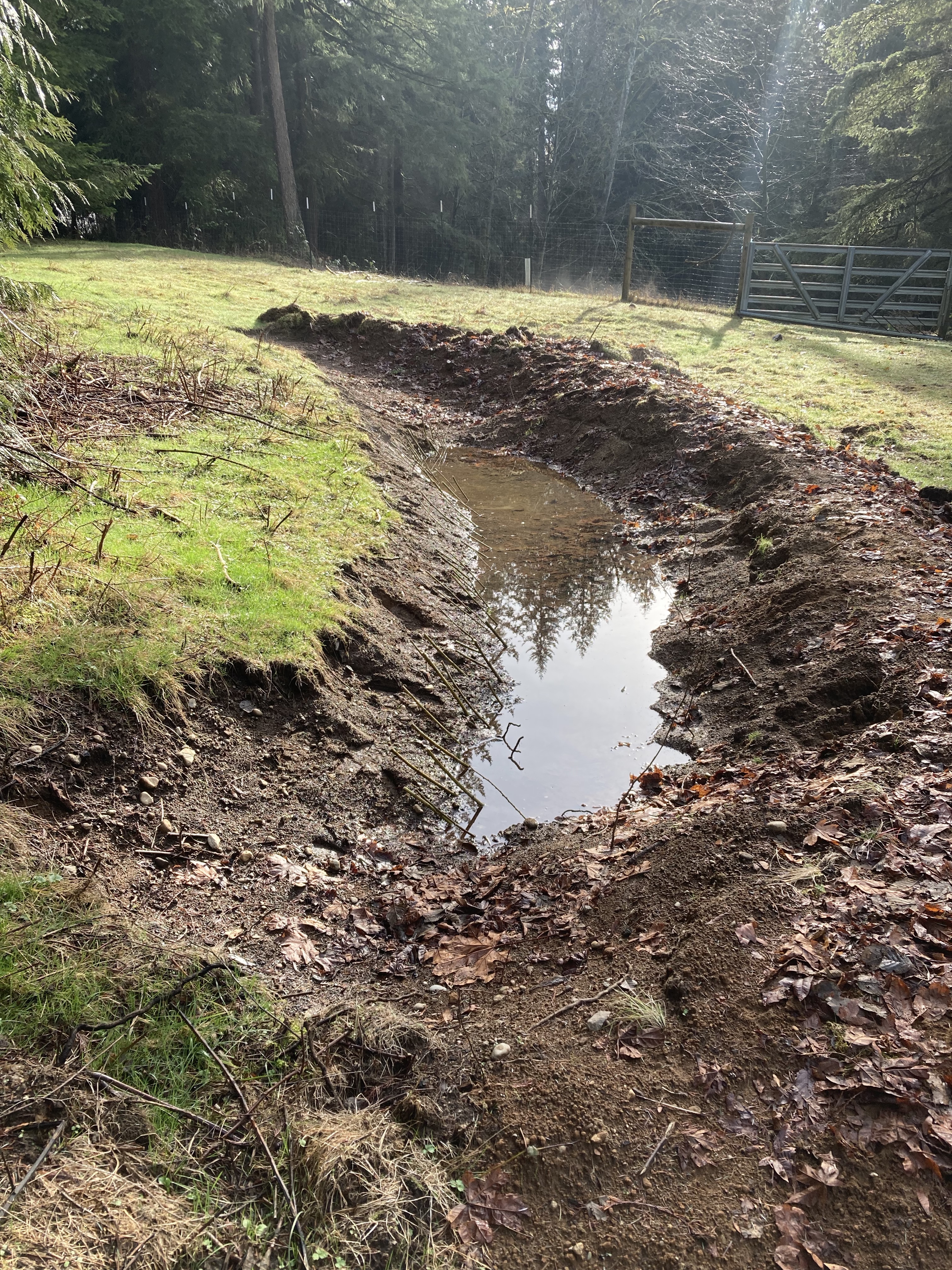This swale is communicating a lot in its first year; our lack of rain so far this winter, soil compaction and a lack of organic material on the surface of these pasture spaces, and how much runoff comes from the hill above -even with a forest buffer. From water table to runoff, this area of the landscape is a seep in the wet months, and will catch a lot of water in major rain events. But the water is going away fast, stopping and dropping into the soil instead of coursing down to the creek all at once and flooding down to the sound and out to sea. California’s recent flooding was a master class in poor water retention, preventing the recharge of major aquifers. Even in Western Washington, a temperate rainforest, the water is running off the hills and out to sea with similar effect, though we have been slower in discovering this loss because we still get a lot of rain.