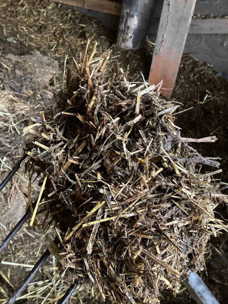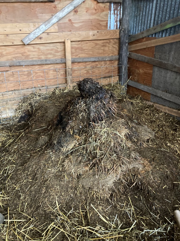 Some of our manure mulch is being staged for new native plant beds of shrubs. These now two foot high piles of seeming chaos are actually full of good living things like worms, fungi, and carbon breakdown. The straw, cardboard, and woody branches fold in to add additional carbon to the maturing soil. This spring we’ll spread an initial cover crop into these planting mounds and by fall of 2023, we’ll set root stock of hedge species like hawthorn and bitter cherry. Fruits from these two species will feed our chickens, and wildlife. We’ll coppice the shrubs for more carbon to compost back into the soil or to burn as kindling. There is endless possibility in utilizing manure as compost, folding in the physical work and cooperation with other systems like the chickens and sheep, mimic the restorative cycles of a balanced ecosystem. Elk, deer, grouse, and geese would have all been present in vast numbers playing the same roles. Seasonal migratory patterns would move the animals on, preventing overgrazing and the need for barns.