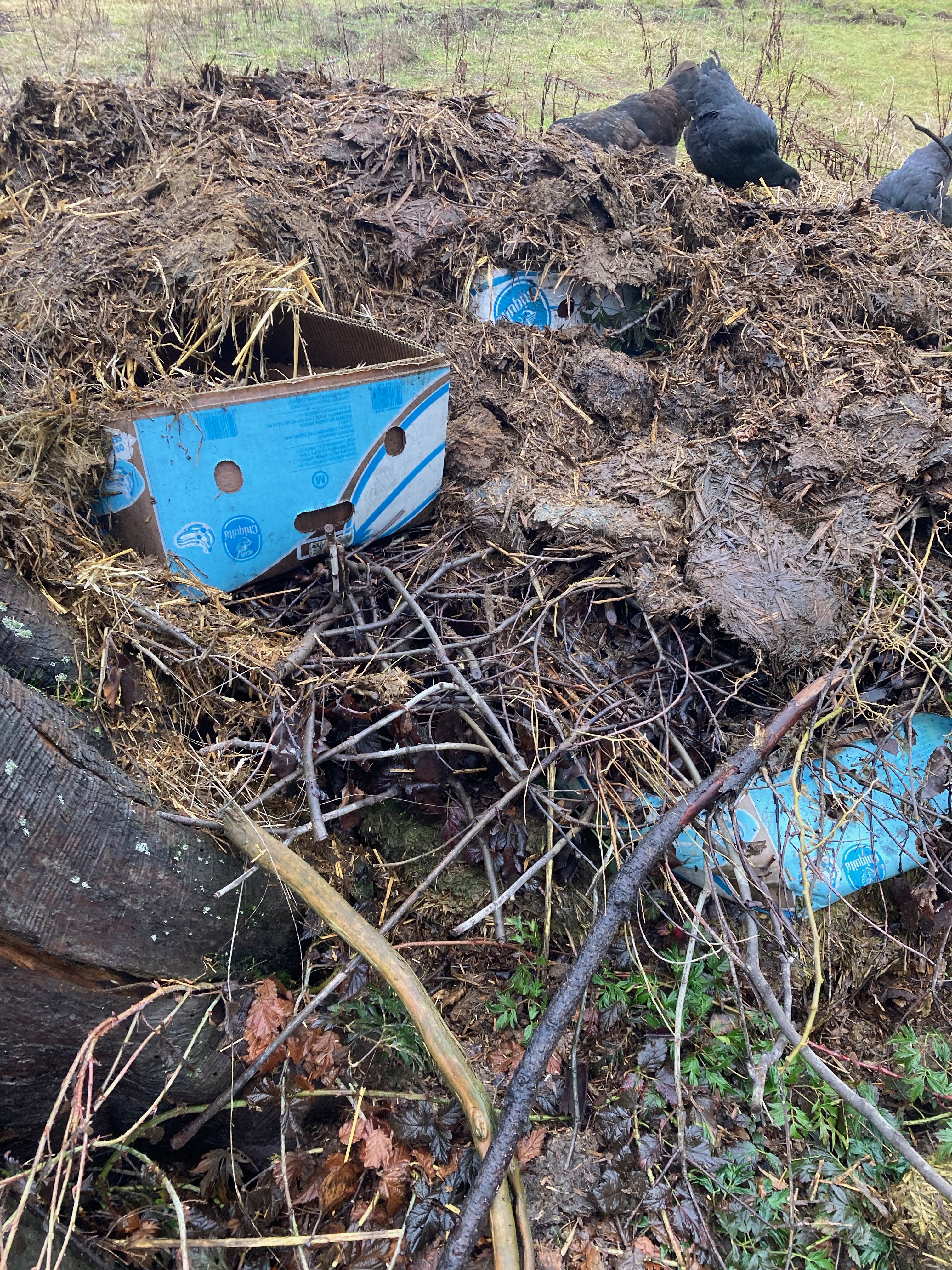 Some of our manure mulch is being staged for new native plant beds of shrubs. These now two foot high piles of seeming chaos are actually full of good living things like worms, fungi, and carbon breakdown. The straw, cardboard, and woody branches fold in to add additional carbon to the maturing soil. This spring we’ll spread an initial cover crop into these planting mounds and by fall of 2023, we’ll set root stock of hedge species like hawthorn and bitter cherry. Fruits from these two species will feed our chickens, and wildlife. We’ll coppice the shrubs for more carbon to compost back into the soil or to burn as kindling. There is endless possibility in utilizing manure as compost, folding in the physical work and cooperation with other systems like the chickens and sheep, mimic the restorative cycles of a balanced ecosystem. Elk, deer, grouse, and geese would have all been present in vast numbers playing the same roles. Seasonal migratory patterns would move the animals on, preventing overgrazing and the need for barns.