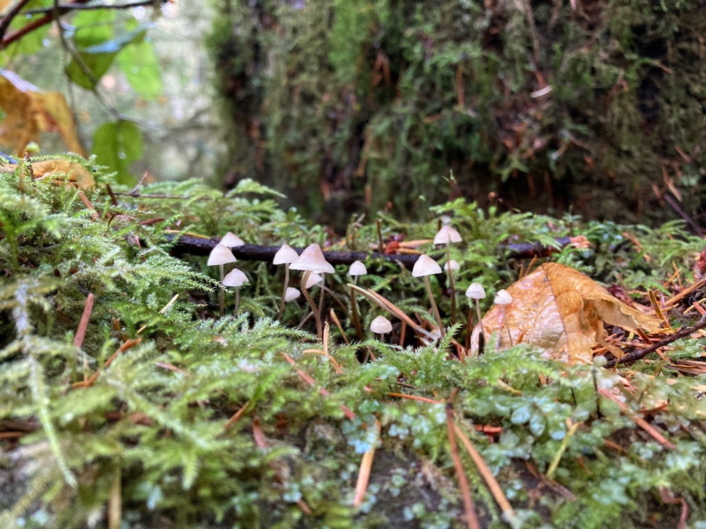 Mycology is present, and helping to break down the woody debris laying all around. Mushrooms play a vital role in developing soil in a forest. The fallen logs are full of tough fibers and tannin, which delay molecular breakdown. If the debris sat on its own, even in the wet environment of Western Washington, it would take so long to decompose, most of the nutrients would be lost before turning back into productive loam for the future old growth forest trying to return. In 4th generation timber stands, there is a noticeable lack of topsoil and nutrients in the ground. The industry now pollutes the ground with treated sewage, to replace badly needed nitrogen, to make more trees grow. This mono-culture catastrophe will never recover in that kind of short sighted industrial management. Fungal factories are still hard at work in commercial forests, and can be severely detrimental to profits in these fake forest when mycological outbreaks happen across the anemic stands.