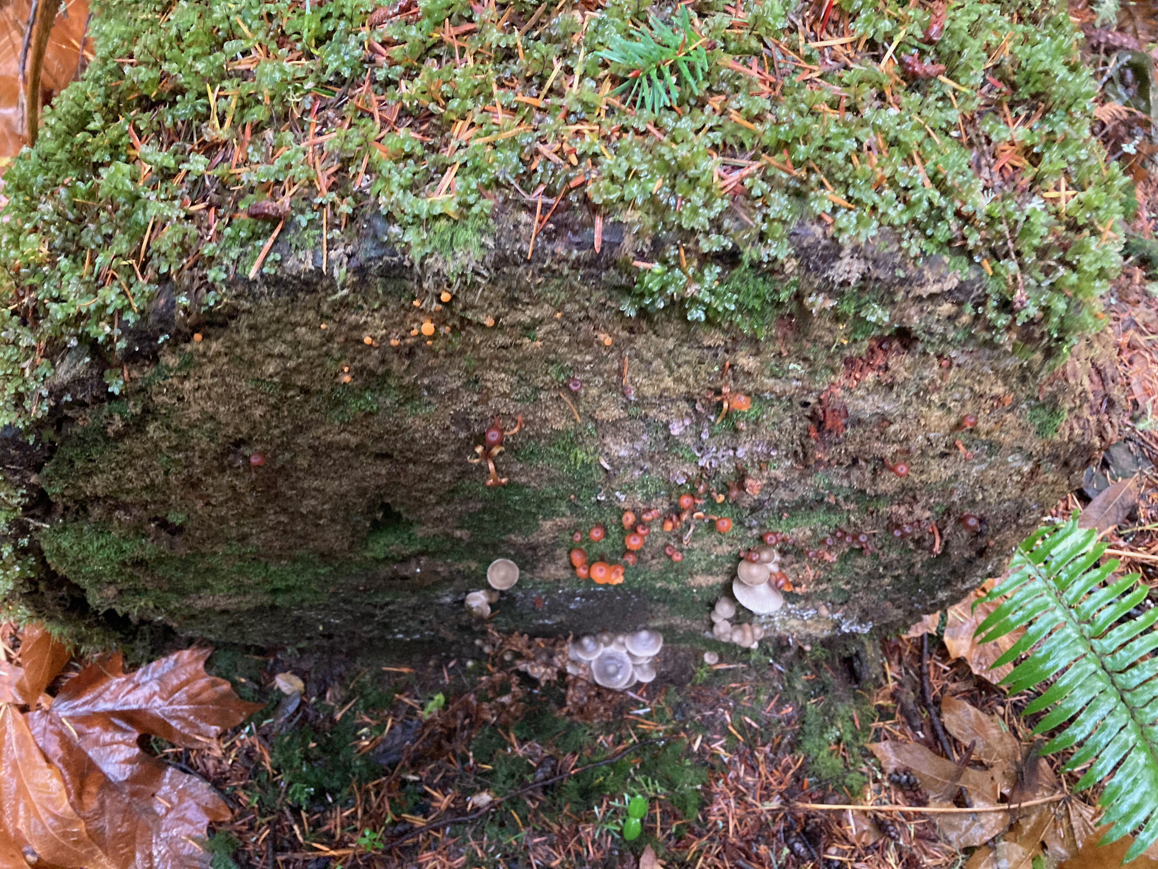 There are a great set of paths through this wetland area, and most of the trail remains above flood areas. That’s a sign of smart trail design with thought and care, unlike much of our development to date, which sprawls at best. The trail has a main rout through the public land into a greater lake park, with multiple entrances. Winding makes the journey longer, but there’s still a good buffer of forest without much human disturbance- for a suburb. Deer brows through, as they traverse the rest of the neighborhood, but they have to keep moving through, as the patch of forest is a larder stop with finite resources, and somewhat limited verity, but restoration planting has occurred, slowly diversifying the ecology for a more adaptive and productive forest. The diversity of fungus within most forests, boggles the mind, and yet, without old growth, there’s a marked difference in scale. Fruiting fungus- like the capped mushrooms we’re most familiar with, are much larger in old growth settings that I’ve observed. Chantrelles on the other hand, don’t pop up in old growth often, as they prefer younger, disturbed areas, like commercial fir stands, especially the 15-30 year old plantings. So again, every species has its preferred environment. Since this suburban public land forest is mostly fir, 20-30 years old, we’re in a chantrelle habitat, and I’ve found them here in past years, but this season, with the drought still on, it was the surface verities, mostly wood eating verities (not chantrelles), which were blooming in the light rains that had finally come.