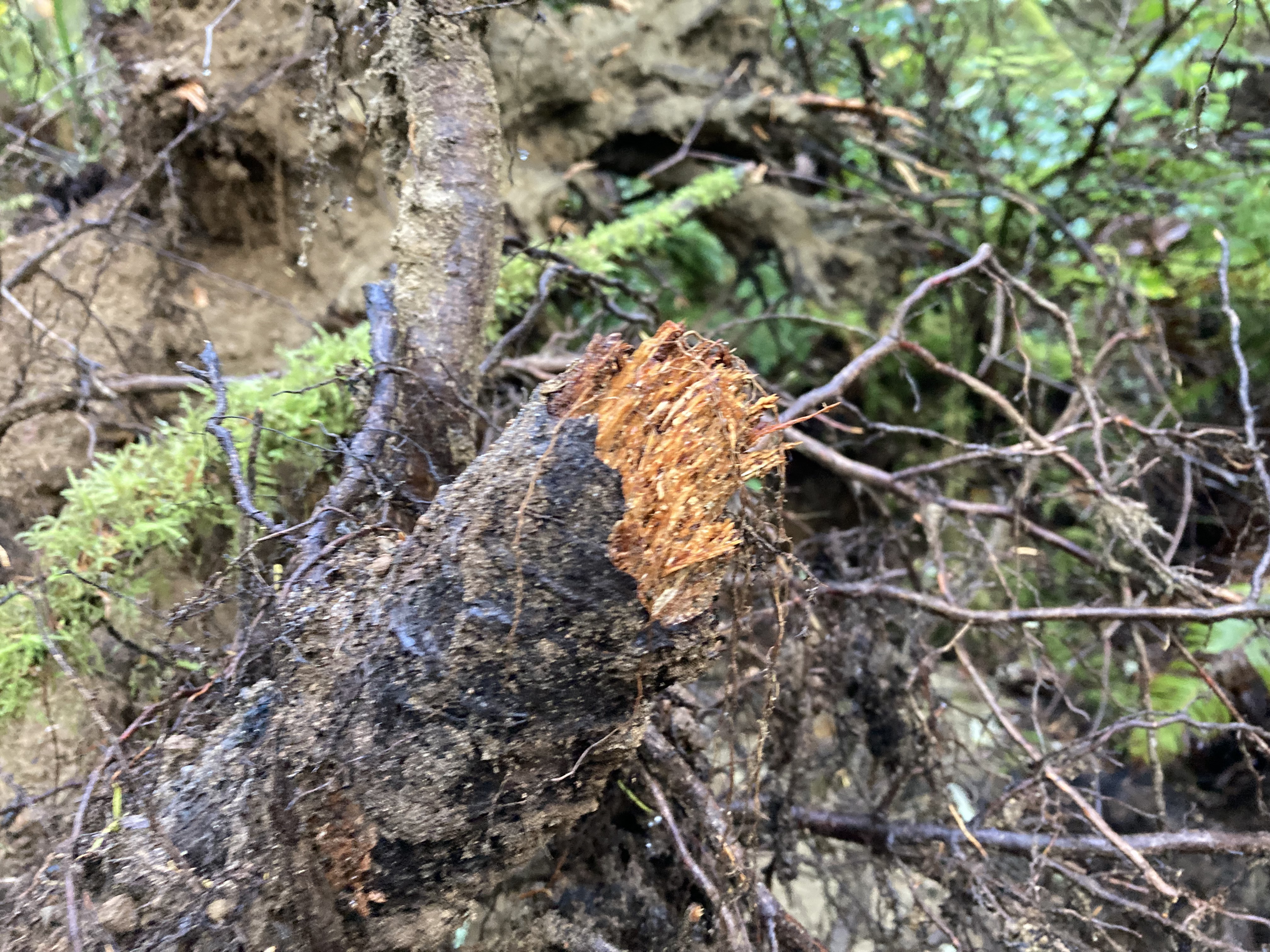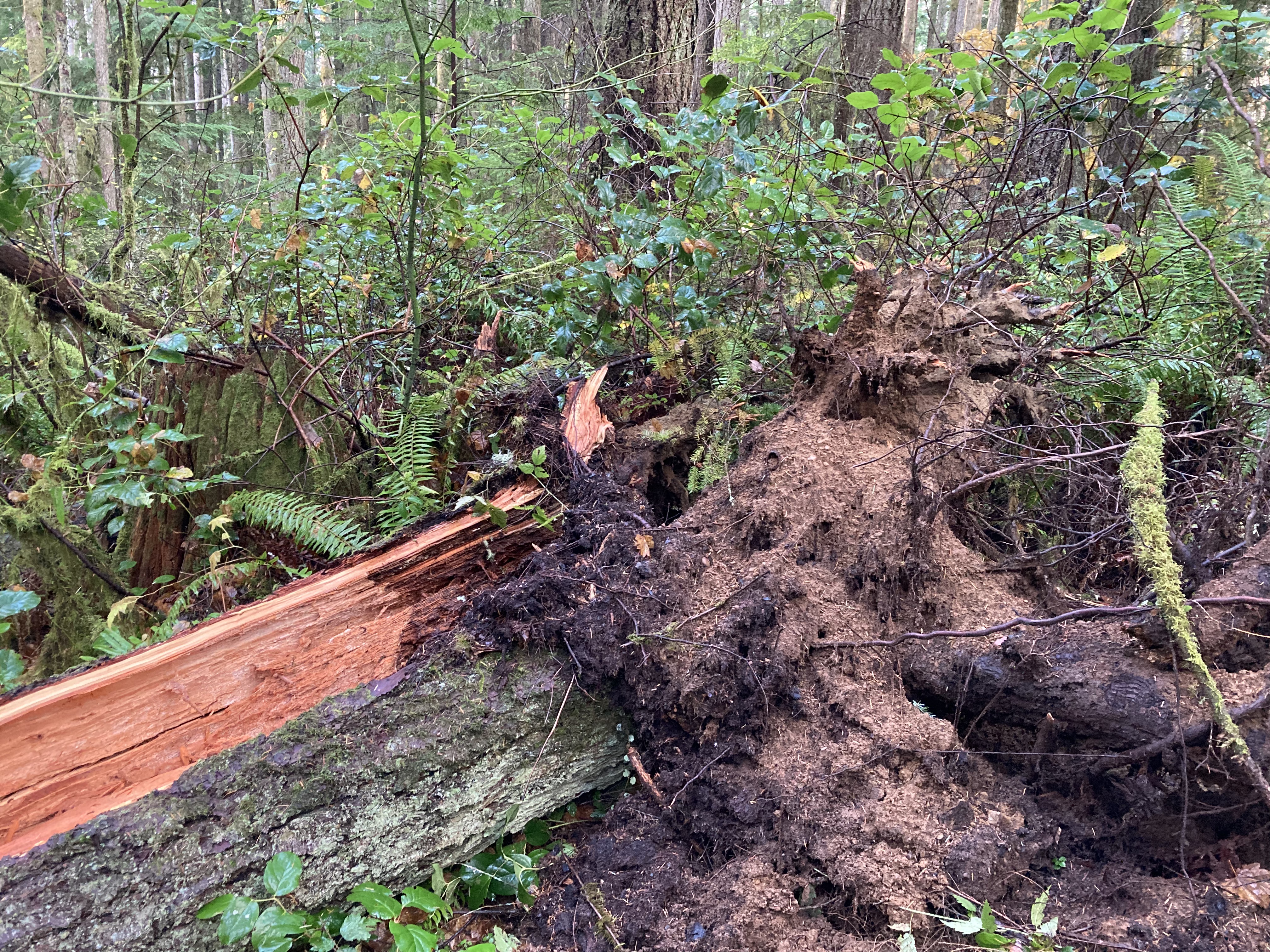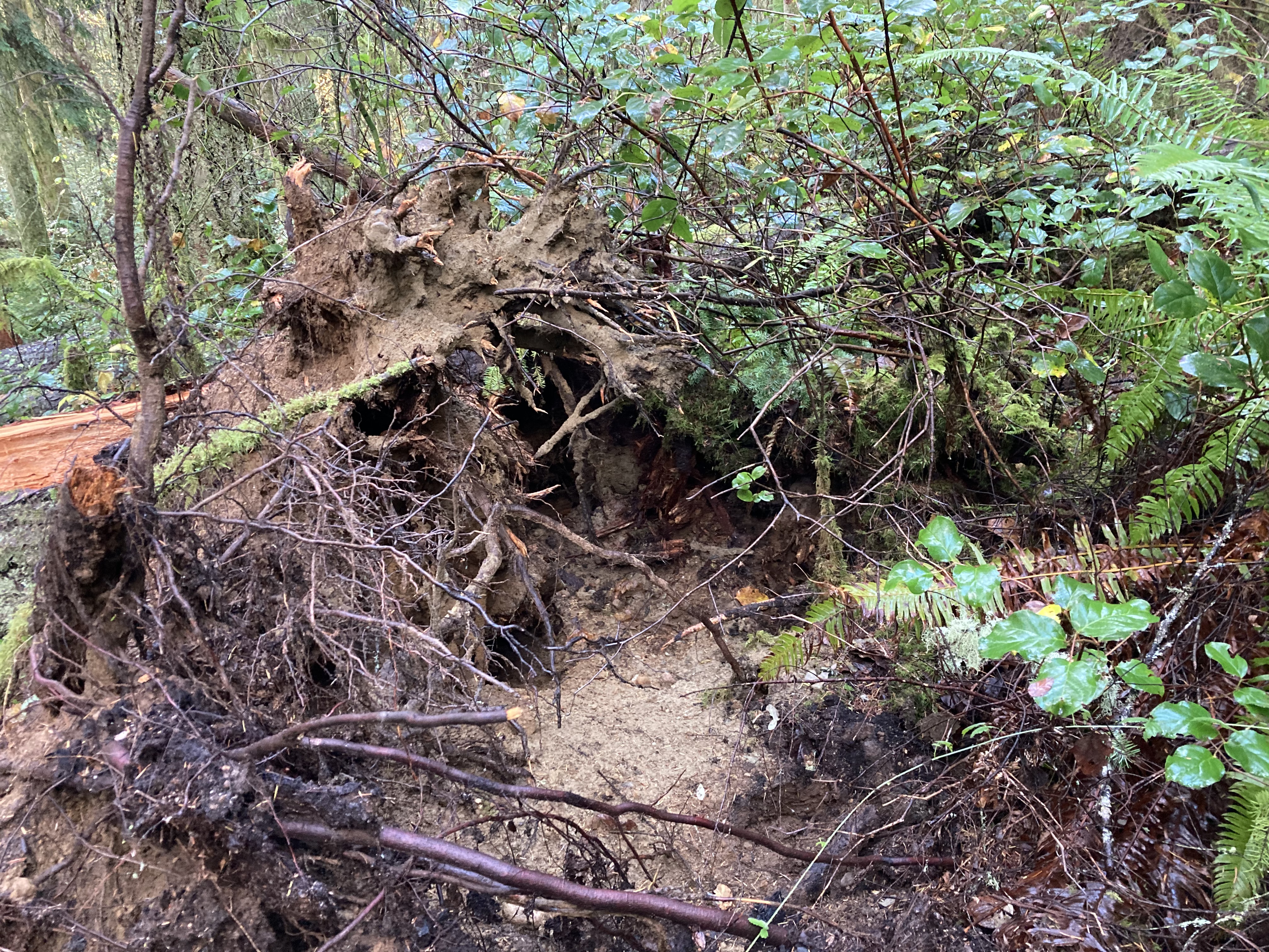 Fungal invasions of today are helping to open up long term old growth areas in the same way beaver, weather events, and geological upheaval do. Clear-cutting is also part of that cycle, if kept to a scale comparable to the other natural cycles it could mimic. Timber industries love to talk about how their forests are renewable. Green washing consumerism teams up with timber industry forest replanting as “plant a tree” carbon offset glitter, and, as the washing implies, it’s not all gold (profit). The cost in biomass lost from the landscape through a century of tree removal is immeasurable. Board feet does not include erosion of silt into streams- unless you want to look at salmon population crashes, but then you have all the hydro power to contend with. What a web! Like the mycelia that brought down the tree below, there are a trail of clues to help us unravel cause and effect. It will be interesting to watch this forest evolve. There could be a logging date in future for this plot, most state land is in a timber harvesting forest plan.