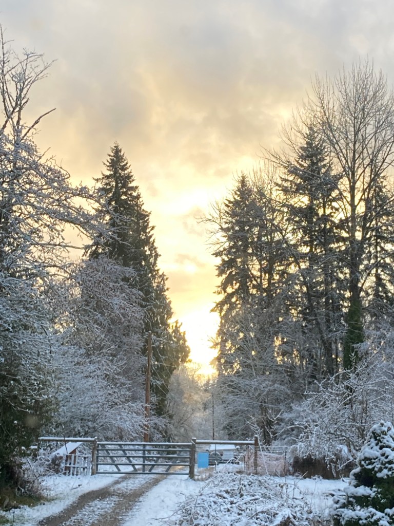 That golden light on Winter’s last stand shines triumphant with Spring’s banner of warmth heralding the end of cold quiet and the beginning of new life and fast growing weeds. Lambs leap like leafhoppers into snow melt pastures greening as the day brightens. Two deer stealth into shadow at hedgerow’s end as the dog picks up scent and starts for the thicket. A gate holds back pursuit and dawn spills down the drive and through the window, onto a made bed where two cats sleep curled in blissful comfort. Rooster crows a proud greeting to mourning as she sails over us in pale yellow laced cloud. Heaven and earth meld through another day in paradise.