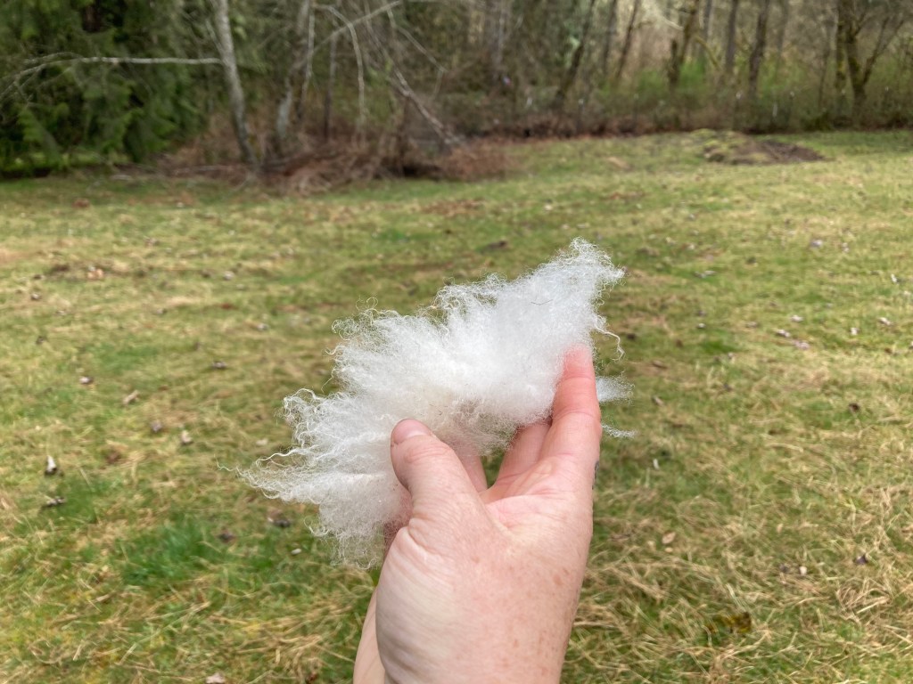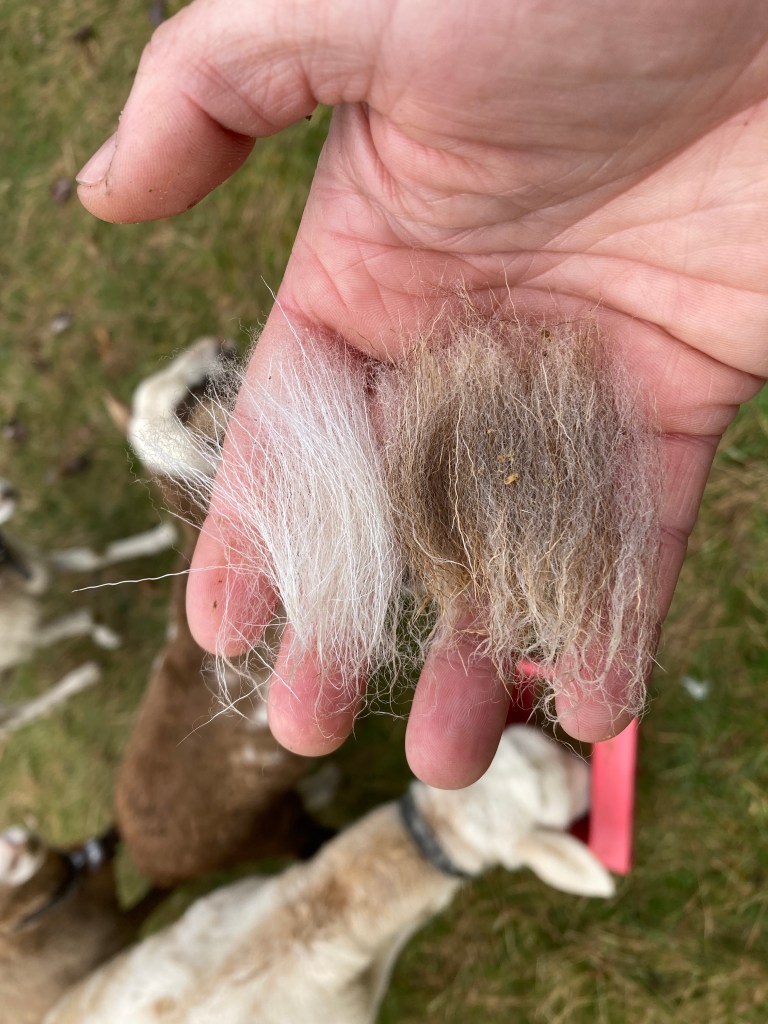 Some hair sheep have a higher wool count in their fleece, the most important aspect of a hair sheep’s coat is shedability. Hair sheds, wool must be shorn. A mix of the two must still shed on a Katahdin. If the coat does not fully shed, that animal should be culled from Katahdin stock to prevent the laps back into wool. In the same way, fiber sheep should not be crossed with hair sheep, or the quality of the wool will decrease. The clump of shed hair below looks very woolly, and indeed, the fiber is longer and wavy, but sheds properly as hair. The ewe producing this coat will most likely be culled sooner, we’ll see how her lambs turn out. The climate of Western Washington is getting hotter, so we’re selecting animals that are more comfortable in summer temperatures, which shedding sheep like Katahdins excel at.