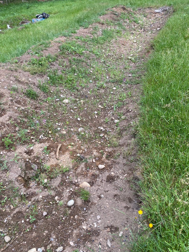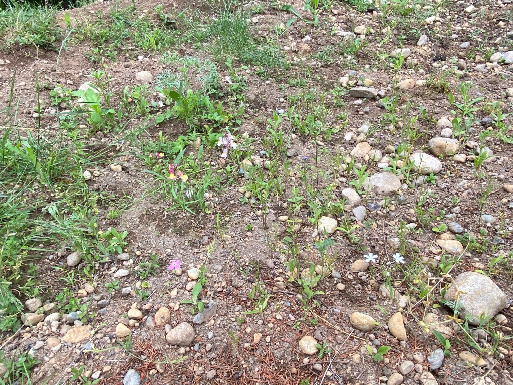 This patch of diverse wildflower spread covers last summer’s earthwork swale project. There’s a lot of glacial till around here- down slope from what was a shallow glacial lake. Compacted clay mixes with the last vestiges of old growth loam, most of which can now be found filling in Puget Sound. The pebbled surface created an abundance of micro climates in a larger water catchment space specifically designed to slow and sink water. The clay dominate soils sheet water down any slope, preventing retention at the surface, which allows water to permeate deeper into the ground. These wildflower seeds found the right mix of sun, moisture, and shade to make a go of it. Bare open ground and a few days of rain summon seeds sewn in April of this year to live. Flowering has continued through most of June, and at the start of July, and our summer heat, we’ll expect to say farewell to these gems for the rest of summer. Perhaps, if there’s another good rain in the next few weeks, we’ll enjoy a revival. Tune in for more bright color and blooming fancy here at EEC Forest Stewardship.