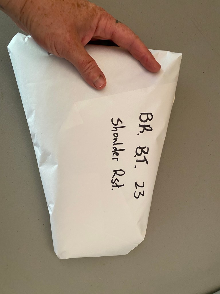 Labeling your cuts to keep a single animal together and to know what’s in each wrap helps when you’re stacking a lot of different things in your freezer. B.R. B.T. 23 means Big Rock, Black Tail 2023. I know where I salvaged this animal (big rock rd.), what species (black tail deer), and what year. Some people put months down too. When I label with Rst. (roast) that means bone in. If I leave the bone out- I say so on the wrapping. Any cuts not a roast are labeled with part names, like back-strap or grinds. Grinds go in a zip-lock to freeze. I’ll grind all my meat at once later this fall, after slaughtering season is over and all the need to grind meat it bagged and frozen. Freezing meat breaks it down a little more, making it easier to feed through a grinder once defrosted again. Pro-tip: cut grinds up well, ,or clog the grinder with sinew and enjoy the headache of constantly taking your grinder apart to fix the blockage.