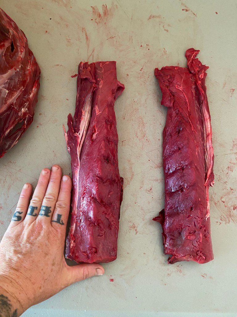 Shoulder bone in looks so good- and reflects the typical cut you would buy in the store. It’s easy to wrap and cook too. Great way to keep as much flavor and meat together for taste and presentation. Because we’re working with a damaged carcass, some of our cuts are going to be a little different, but this doe was only damaged in a few places, so most of the meat will go in the freezer. Take a look at these two back-straps- that’s some delicious, melt in your mouth cuts. The meat is fresh, red, and lean. I’ll pack them together in one package and then cut them into fancy medallions for a meal when I unfreeze them. Again, you don’t have to cut the meat into smaller servings until you are ready to use them. This also prevents freezer burn.