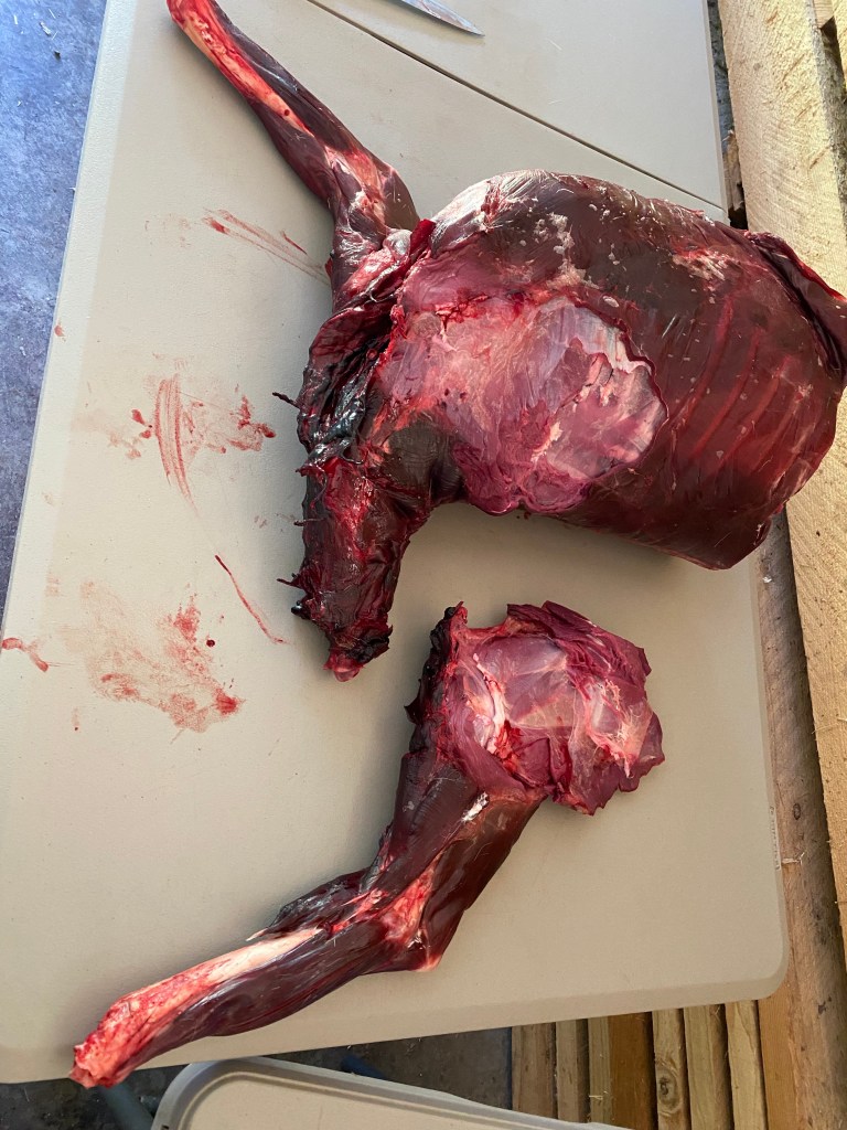 Rib cages are often a challenge, and though I love roasting a rack after I’m done butchering, this rib rack will go to the scavengers to reflect my gratitude for this abundance of wild food. I did scavenge more meat off the bones for our grinds bag- always good to put the trimmings in a bag to grind later for deer burgers. On my sheep, I take the time to carve off the brisket, but deer have little fat in that area, so it went to the woods to feed others. There was also some bruising in the ribs, with a few cracked from auto impact. Bone fragments can become a real danger in the meat; swallowing one can injure a person, so a lot of caution goes into cleaning a scavenged deer. As I began on the back half of the carcass, I found another major injury, which was the cause of the deer’s death. Her right side took full impact, breaking the right metatarsus, cracking several ribs on that side, bruising the lower back, and, as I cut into the pelvis, shattering the right hip entirely into fragments, which I only discovered once Ii began butchering the hind end- can you tell just by looking?