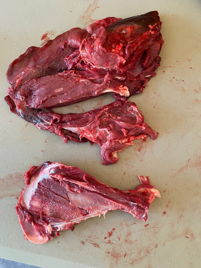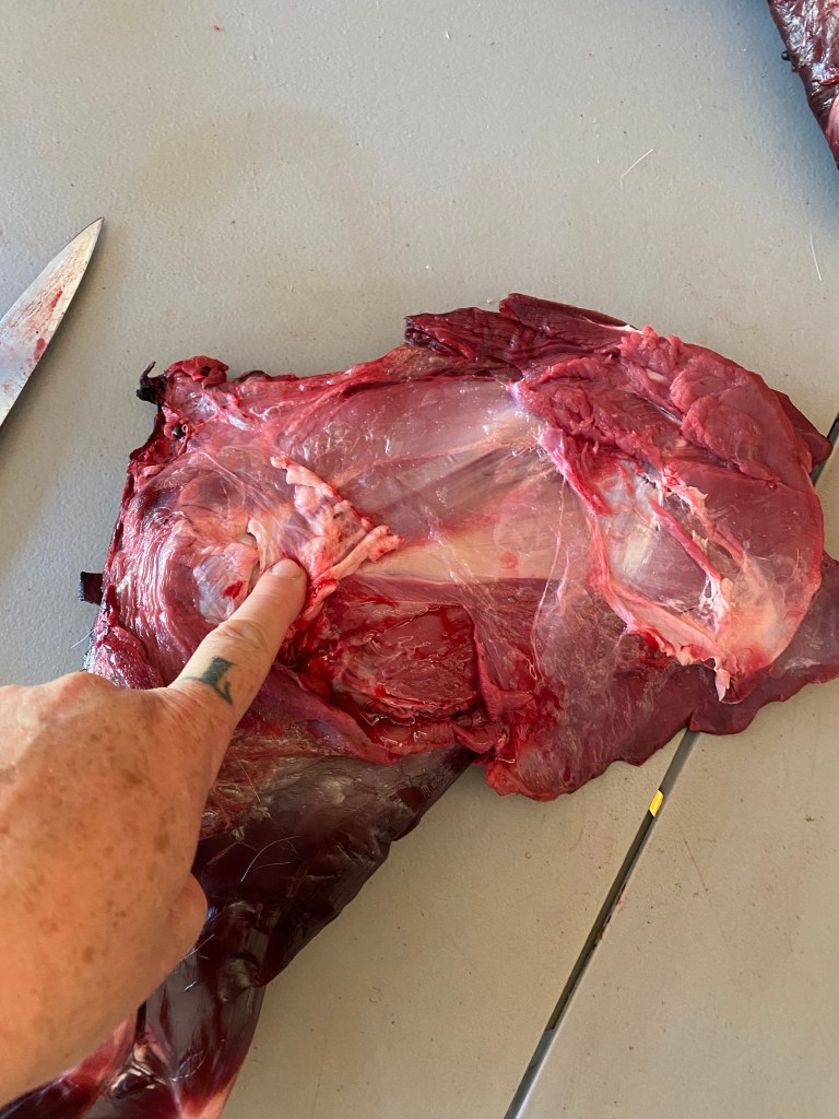The loin roast I cut her (with hand above), had the best cuts and a cute little heart shape in the bone. Back-strap and loin cuts are dreamy, and putting them together in one single package makes for a great shared meal with friends and family, giving a real wow factor to the meal. We’ll still have some good back-strap on it;s own in another cut later in this breakdown. With most roasts I leave the big bones in for flavor, and also to save time in the tedious process of de-boning. You loose a lot of meat de-boning, and less cuts means less work and less chance for bacteria to get in. Separating the front legs from the ribs gives you two shoulders to work with, followed by neck removal. I usually leave neck together and use as a soup stock item. You can cut most of the neck meat from the bone if you want to save freezer space or avoid those complicated vertebra.